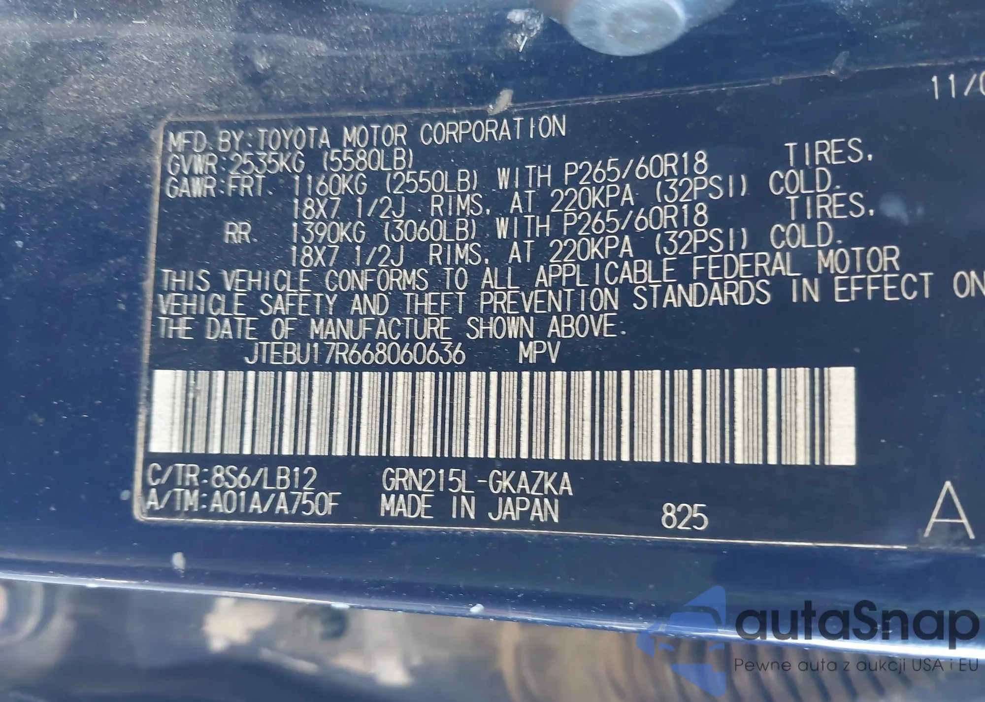 LOT: 43915824 VIN: JTEBU17R668060636