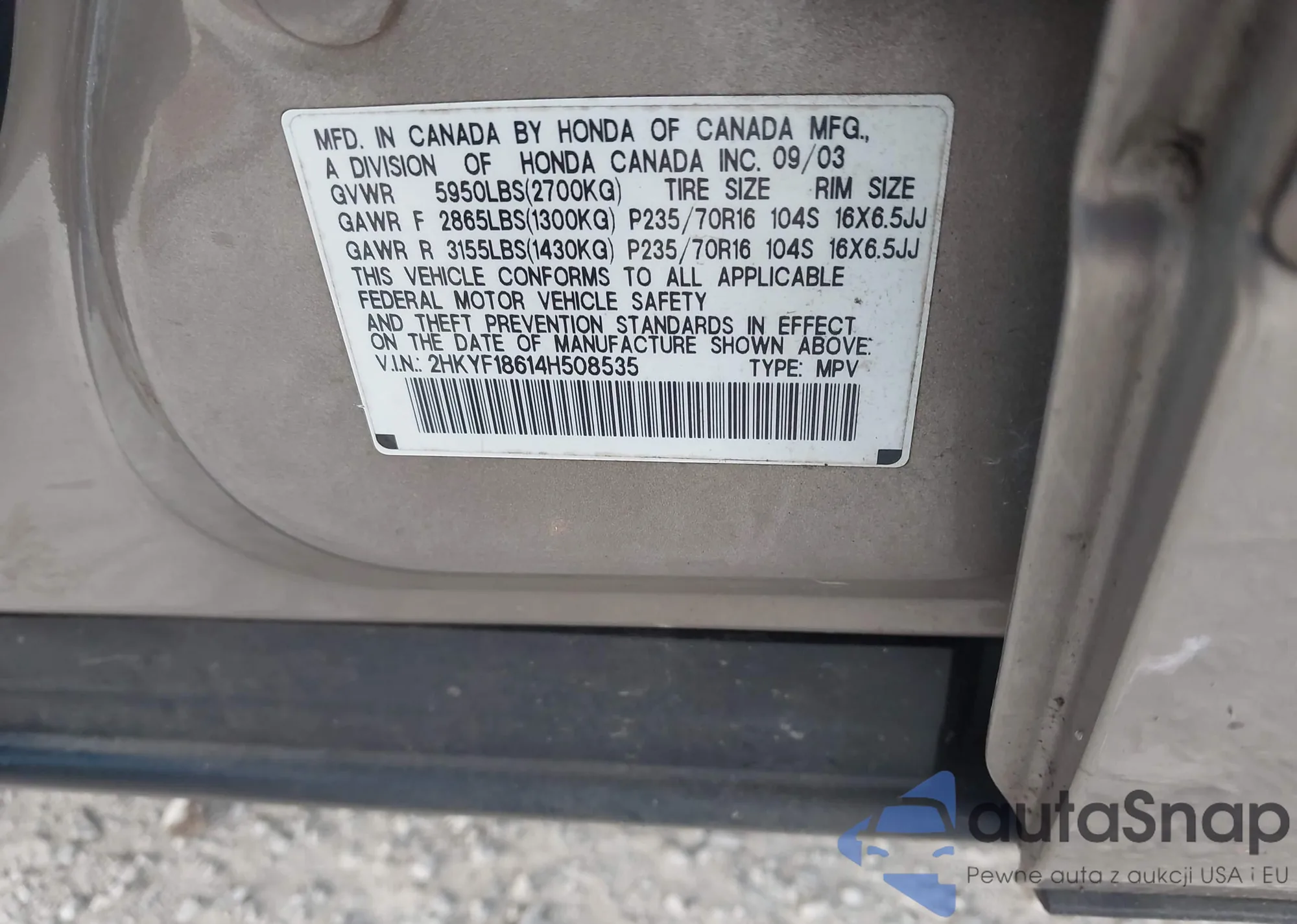 LOT: 44113439 VIN: 2HKYF18614H508535