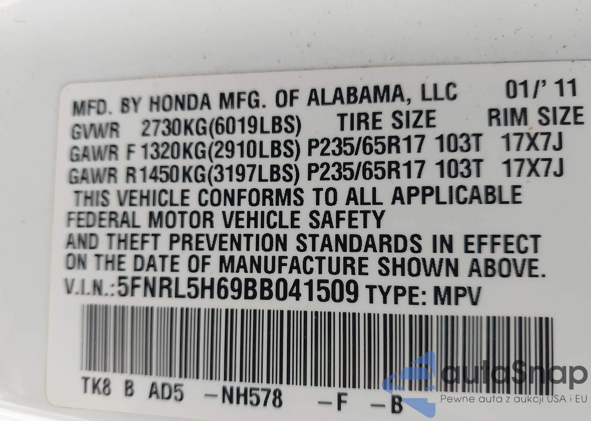 • VIN 5FNRL5H69BB041509