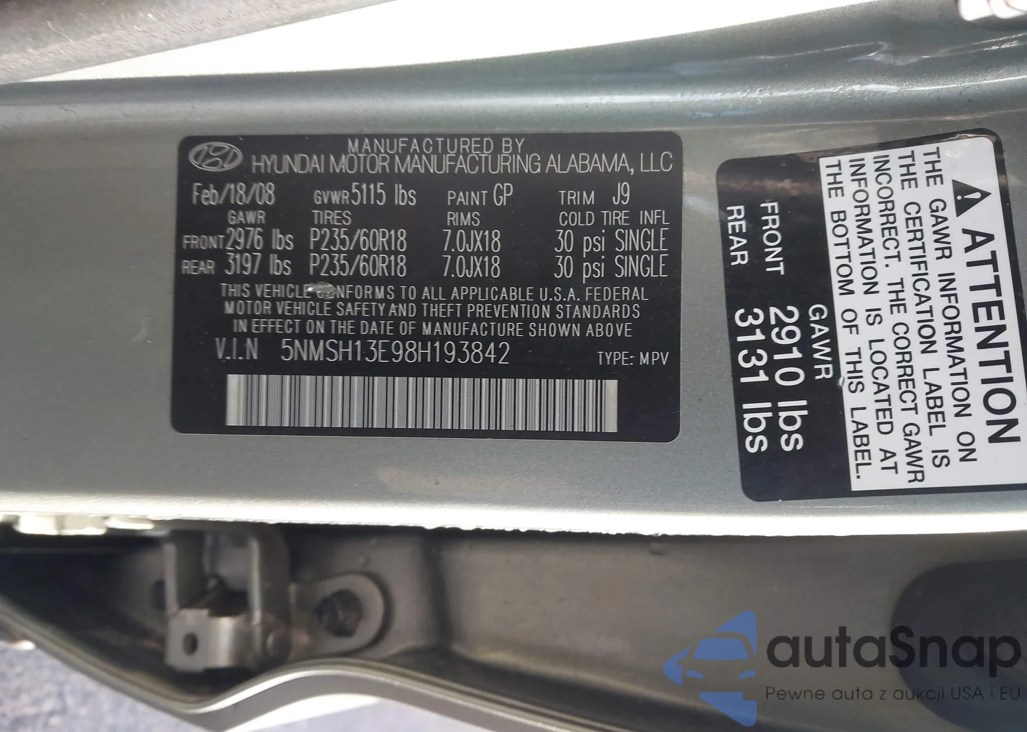 • VIN 5NMSH13E98H193842