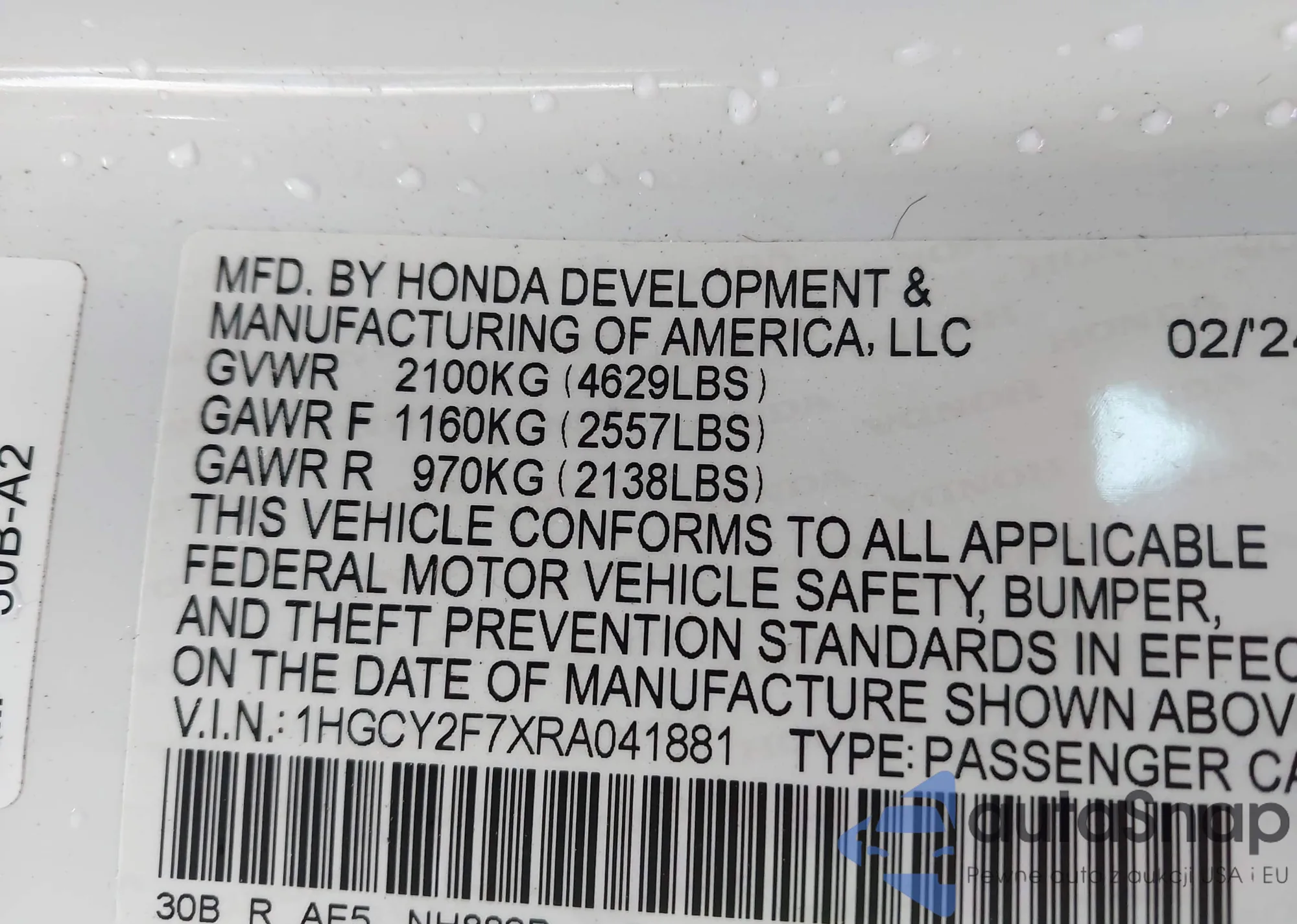 LOT: 44200354 VIN: 19UDE2F75GA018888