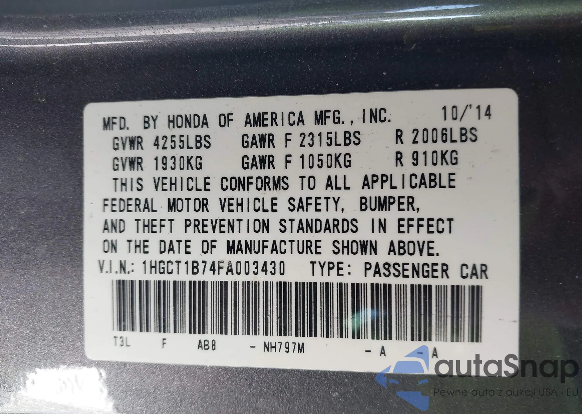 • VIN 1HGCT1B74FA003430