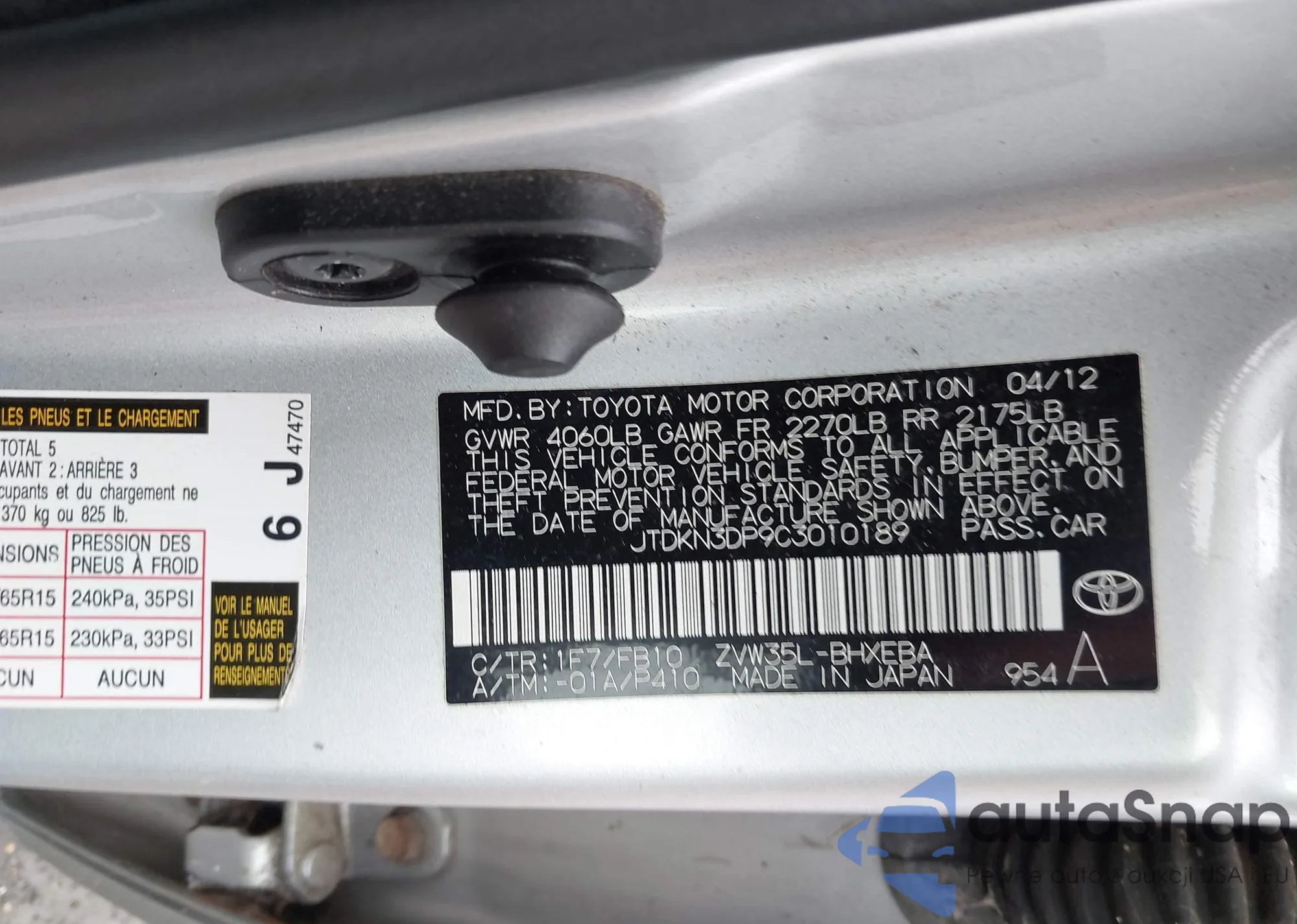 LOT: 44382635 VIN: JTDKN3DP9C3010189
