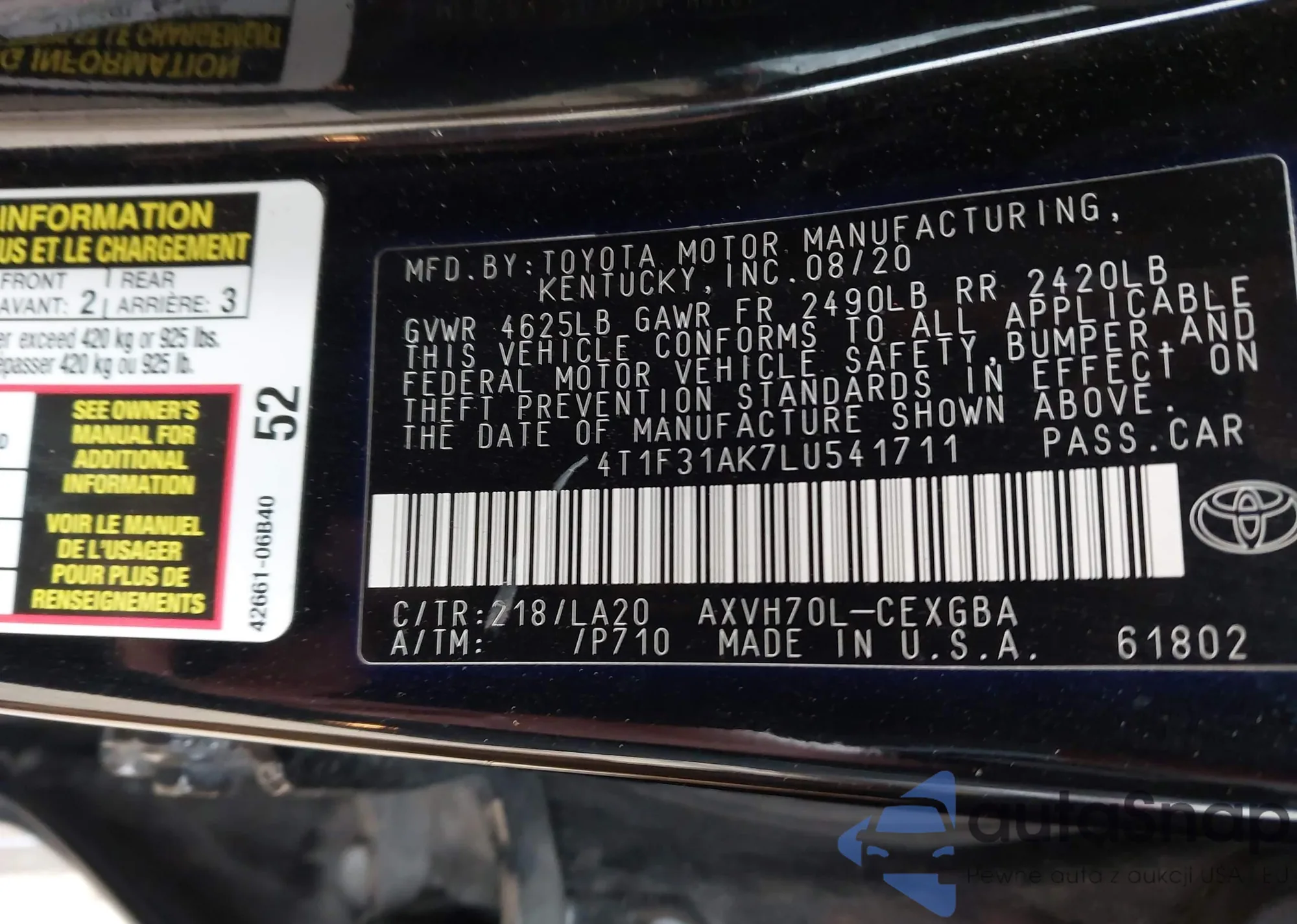 LOT: 44139789 VIN: 4T1F31AK7LU541711
