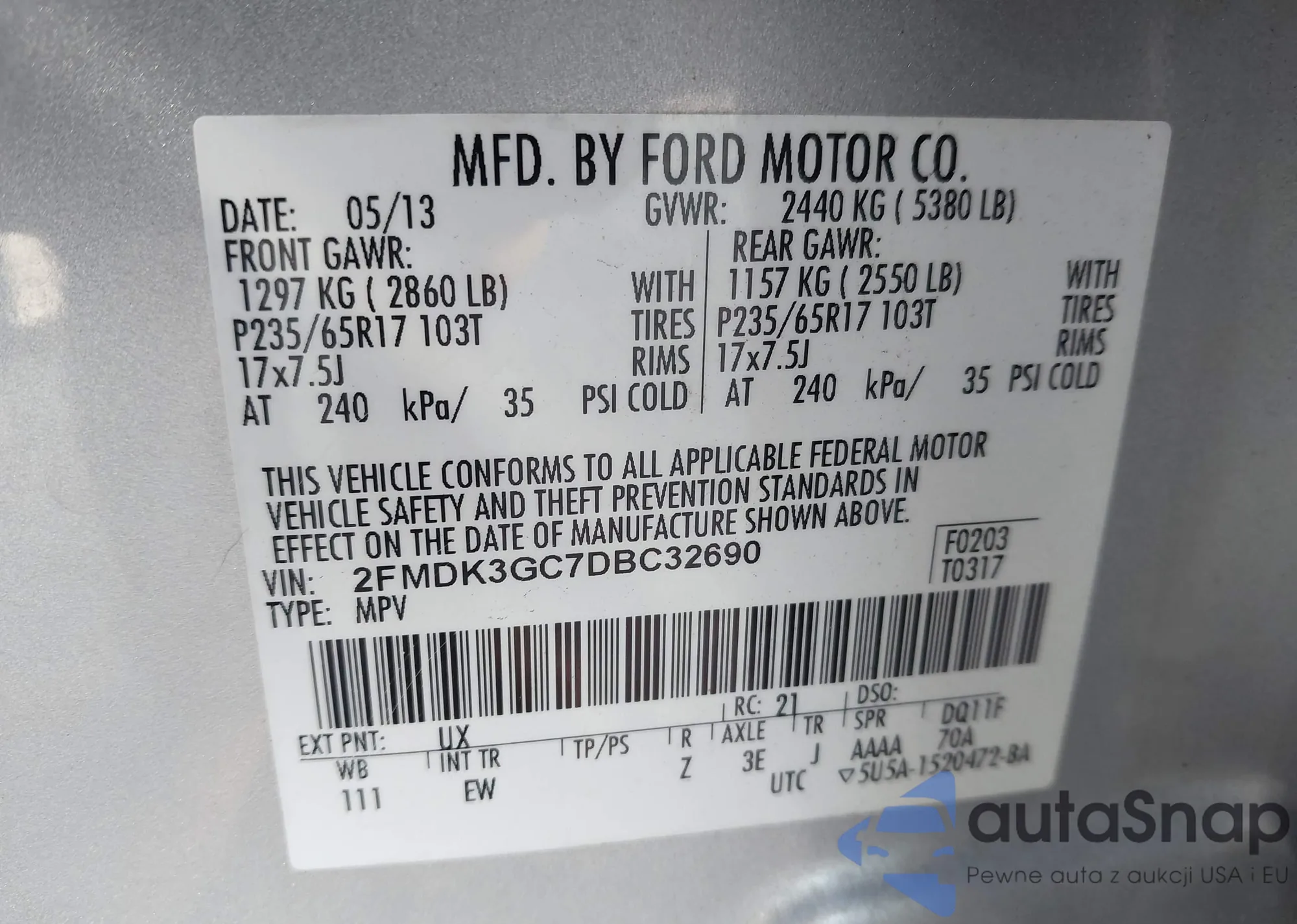 LOT: 44157106 VIN: 2FMDK3GC7DBC32690