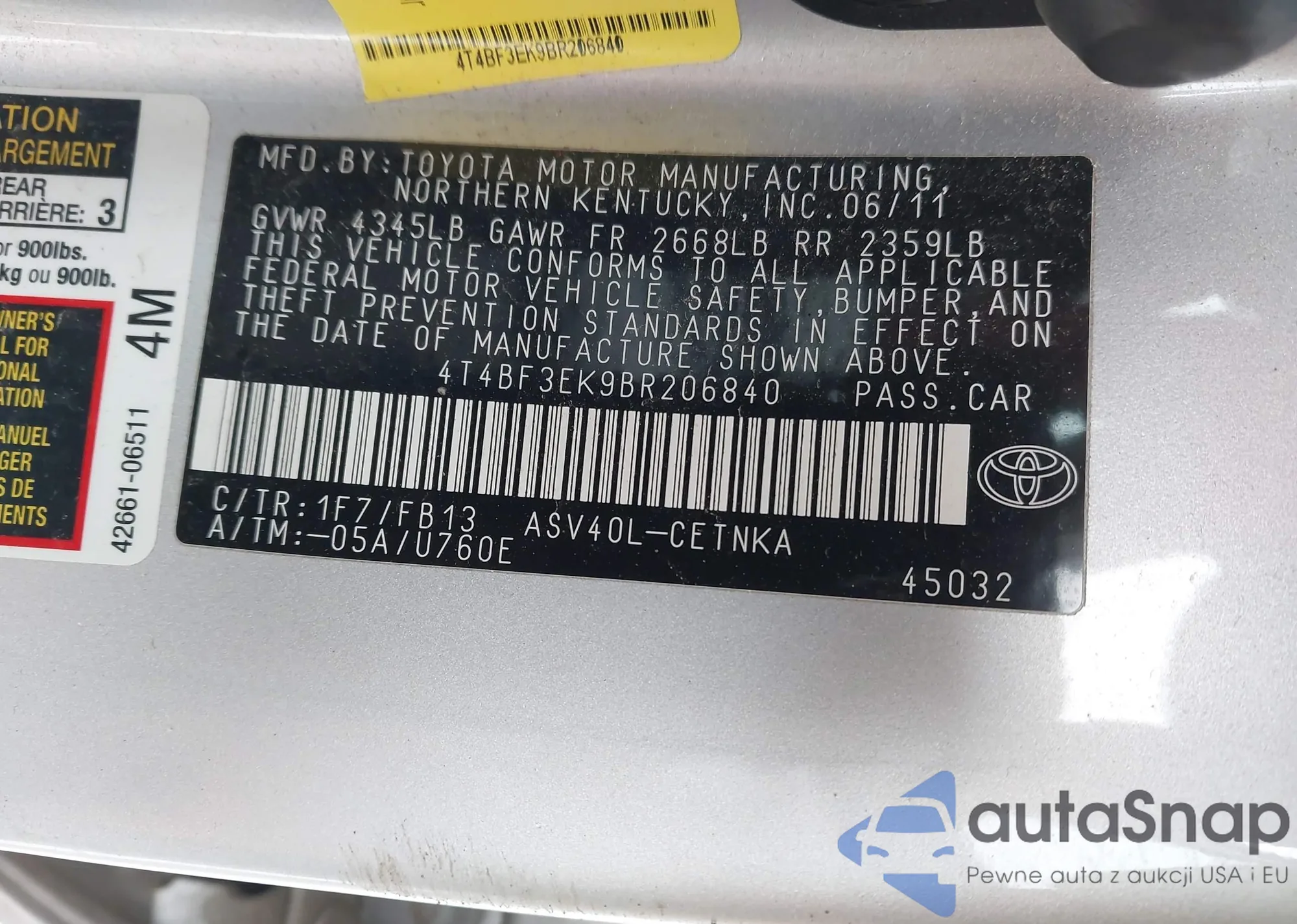 • VIN 4T4BF3EK9BR206840