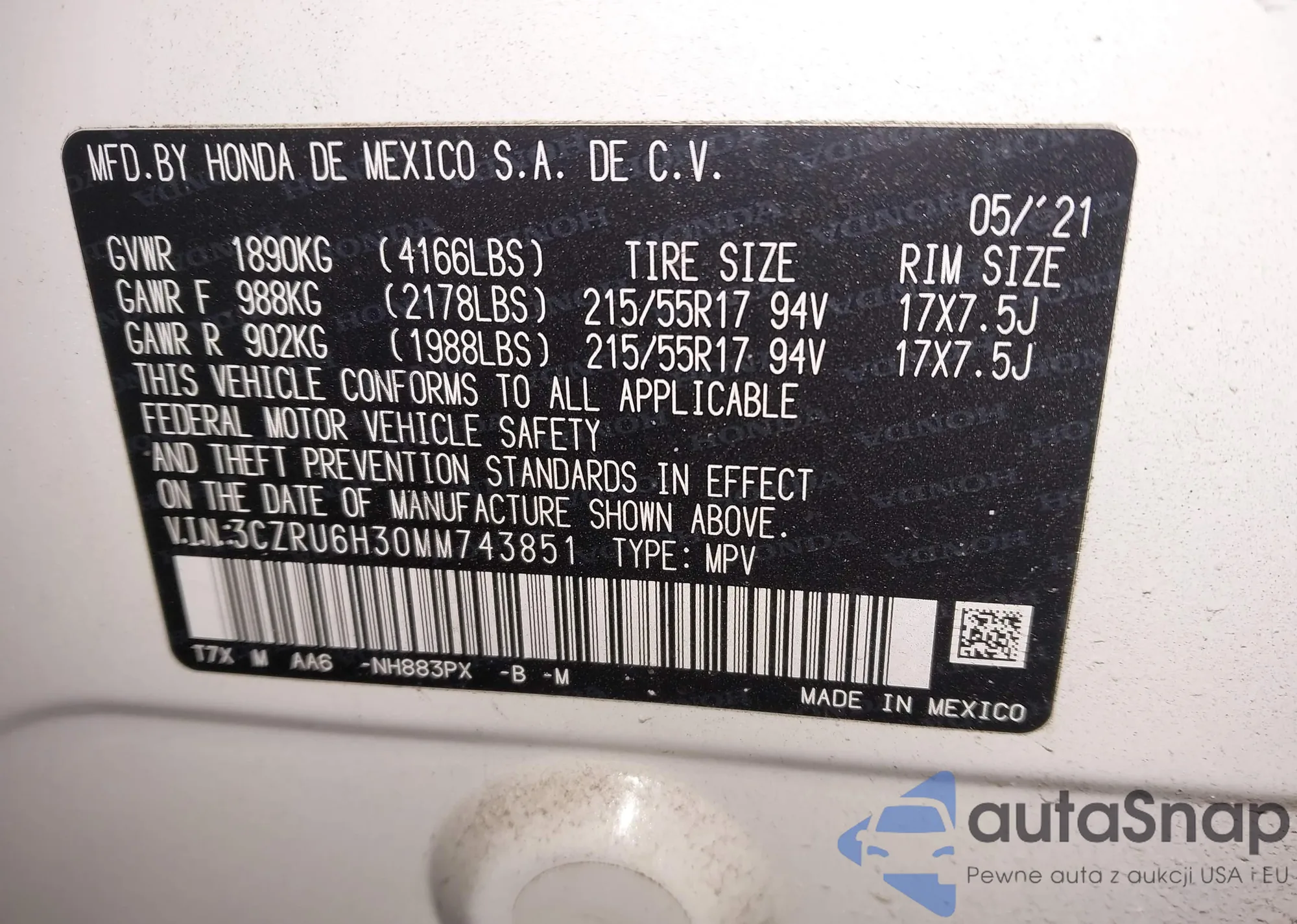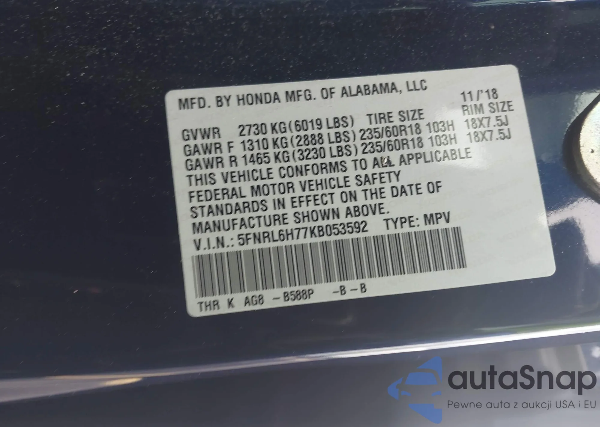 • VIN 5FNRL6H77KB053592
