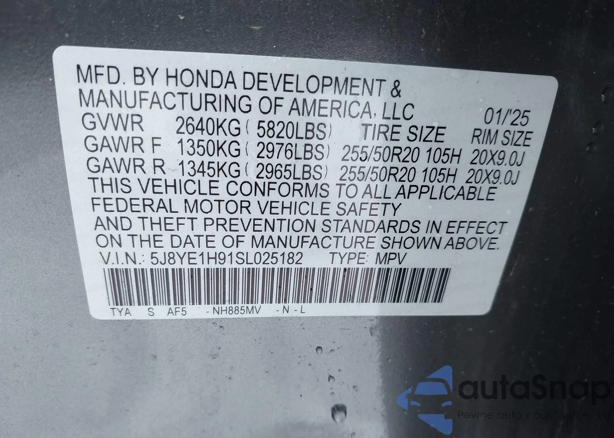 • VIN 5J8YE1H91SL025182