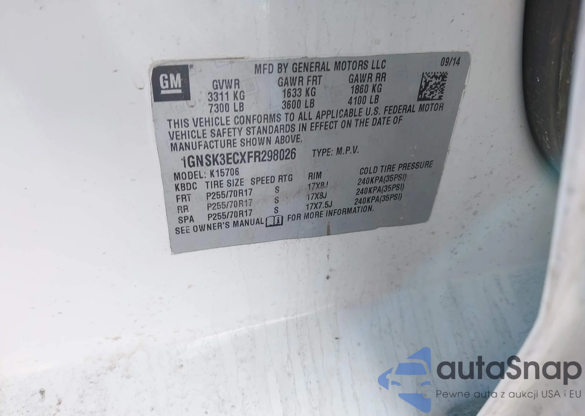 LOT: 43816117 VIN: 1GKKVNED8FJ291793