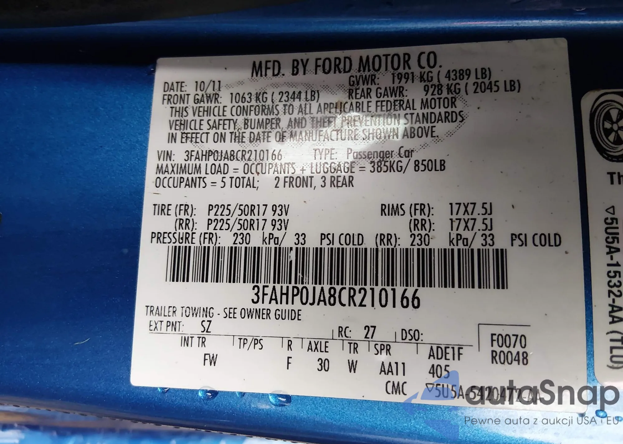 • VIN 3FAHP0JA8CR210166