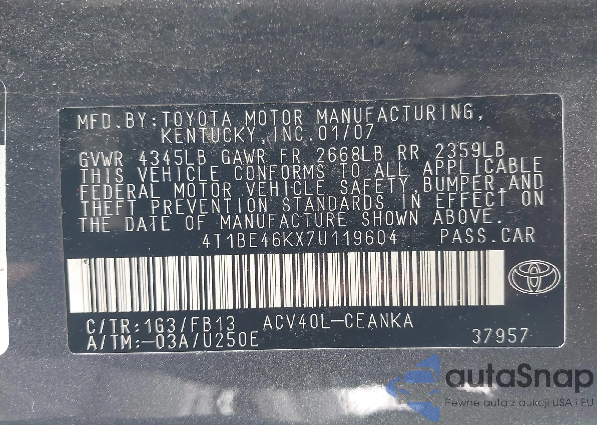• VIN 4T1BE46KX7U119604