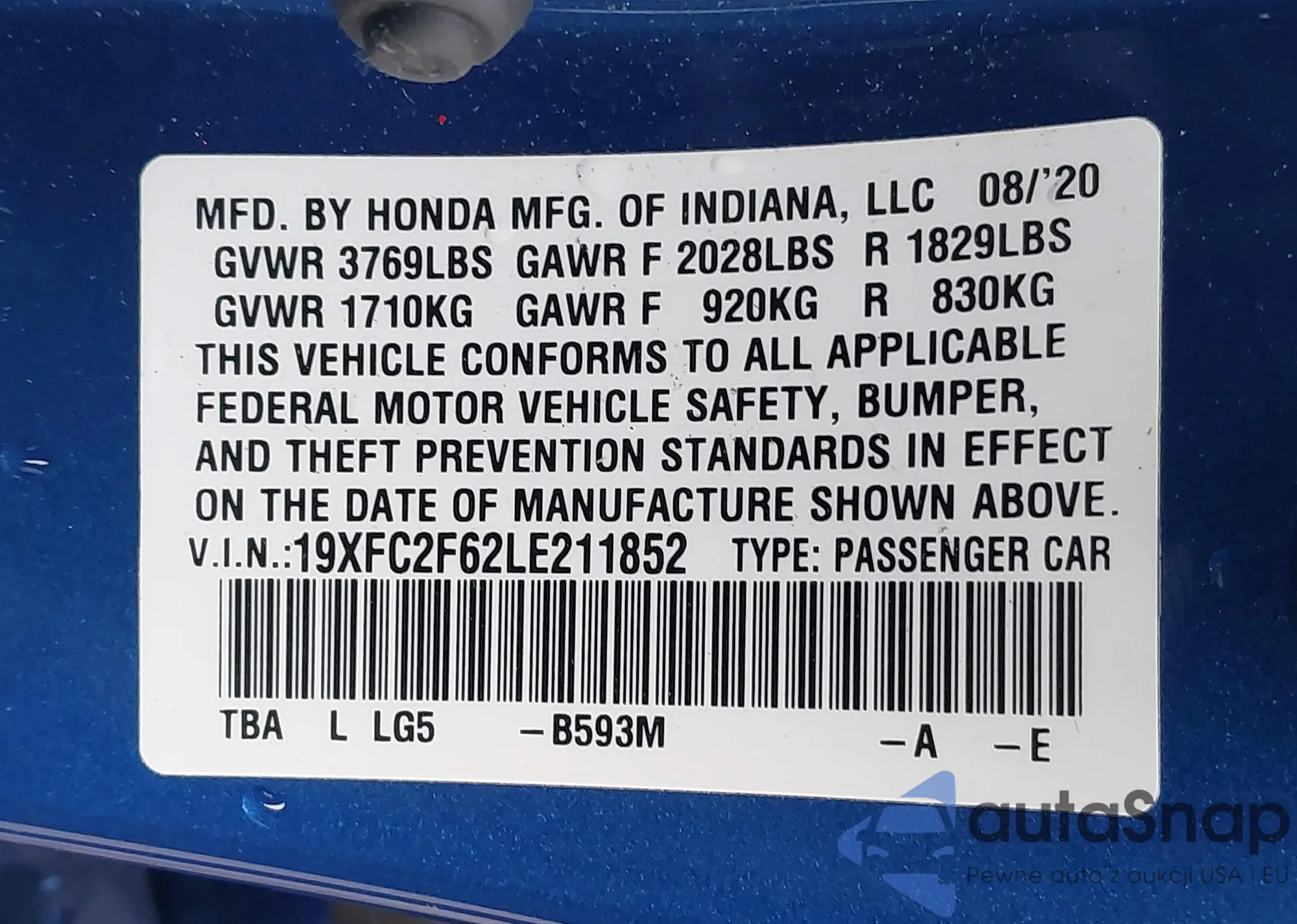 LOT: 43732869 VIN: 19XFC2F62LE211852