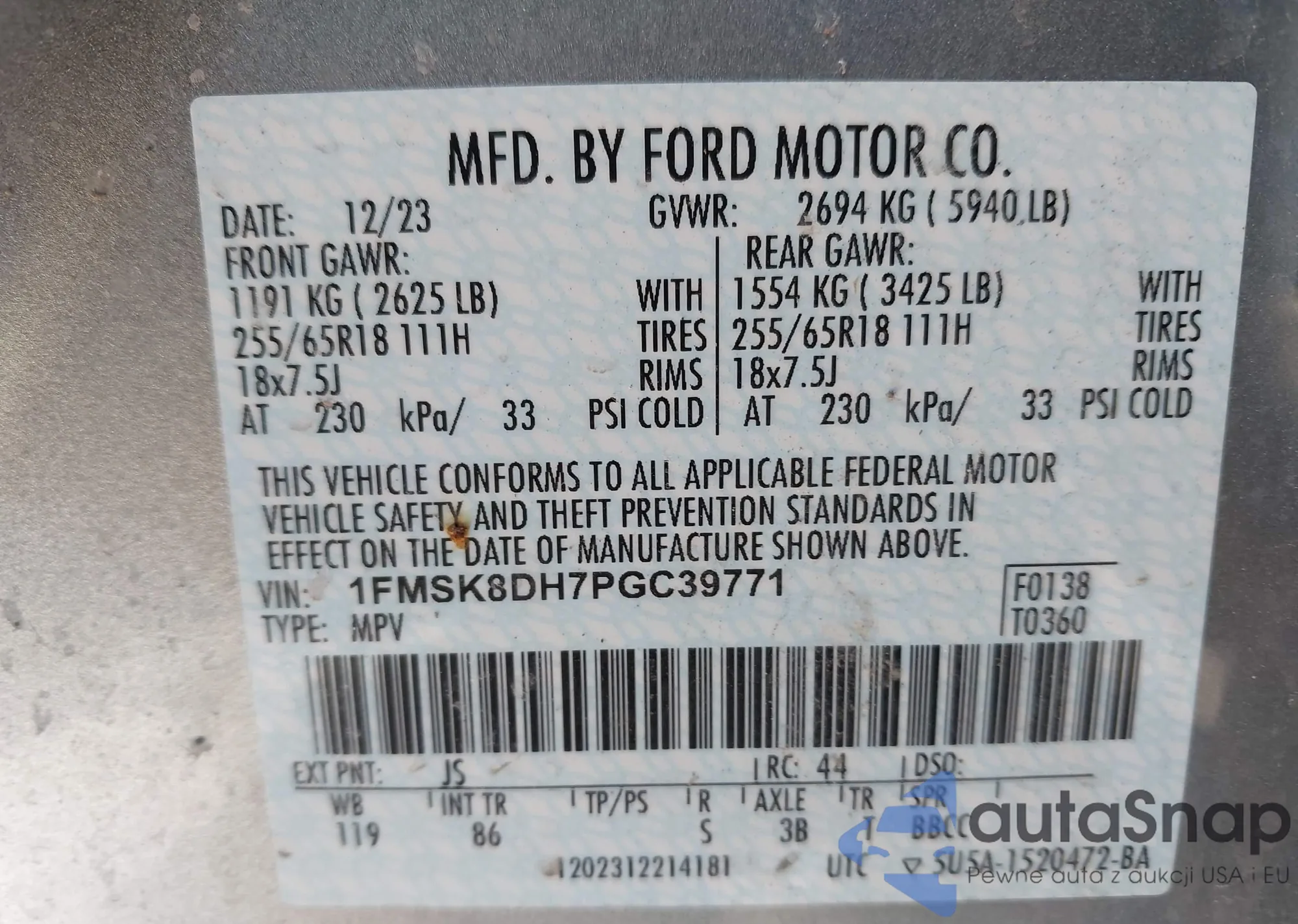LOT: 44155095 VIN: 1FMSK8DH7PGC39771
