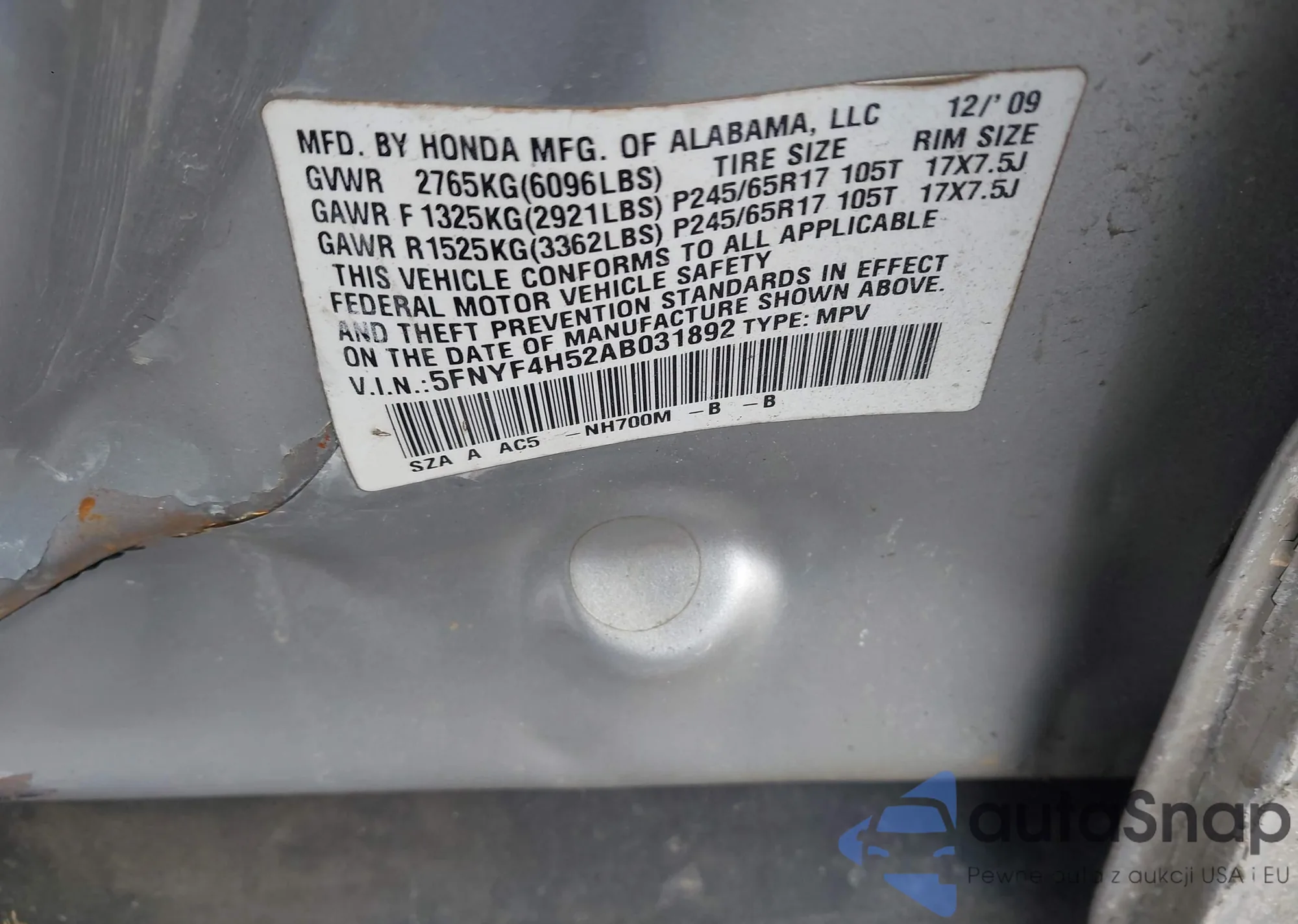 LOT: 44250694 VIN: 2HNYD18622H517010