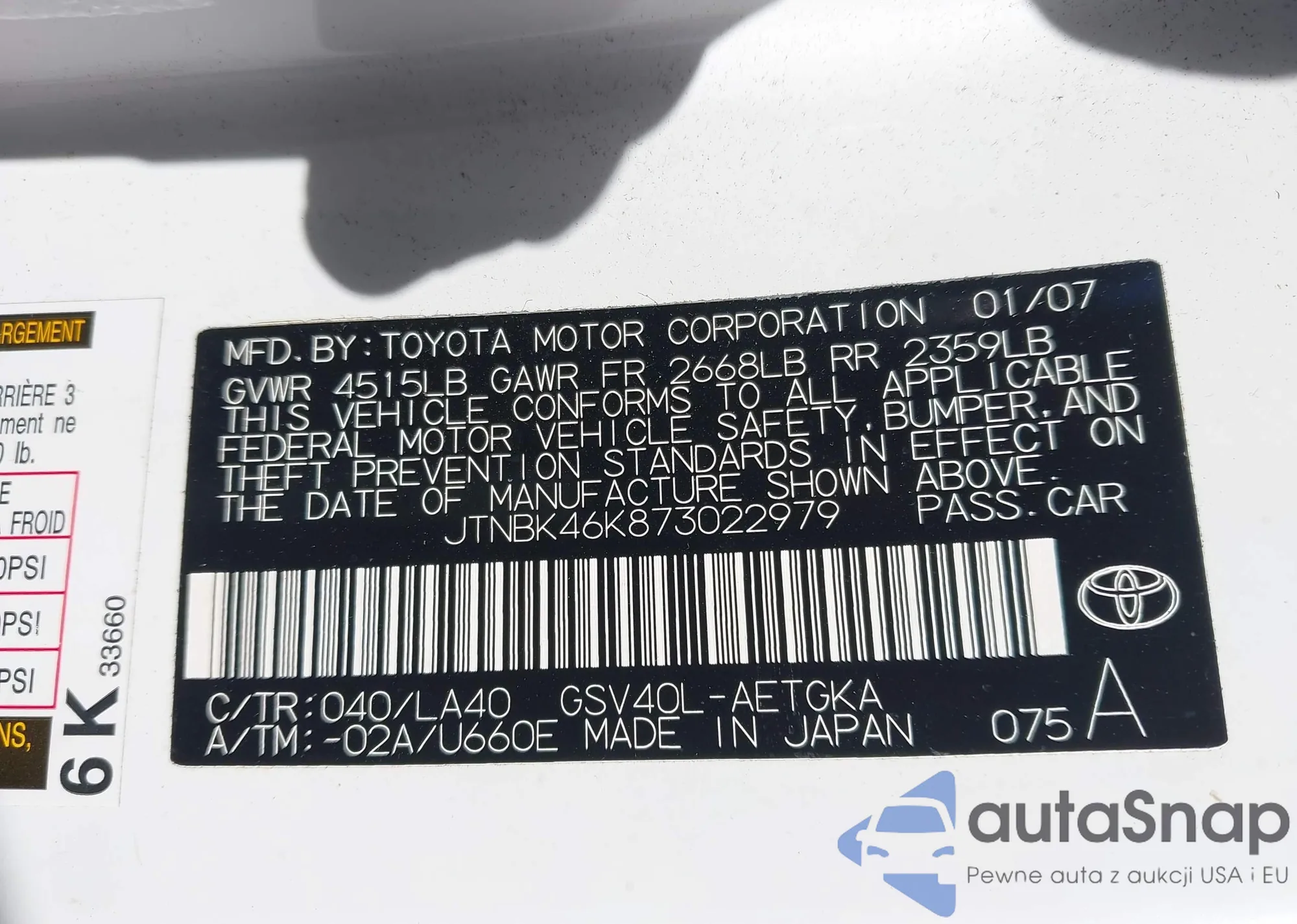 LOT: 44260524 VIN: JTNBK46K873022979
