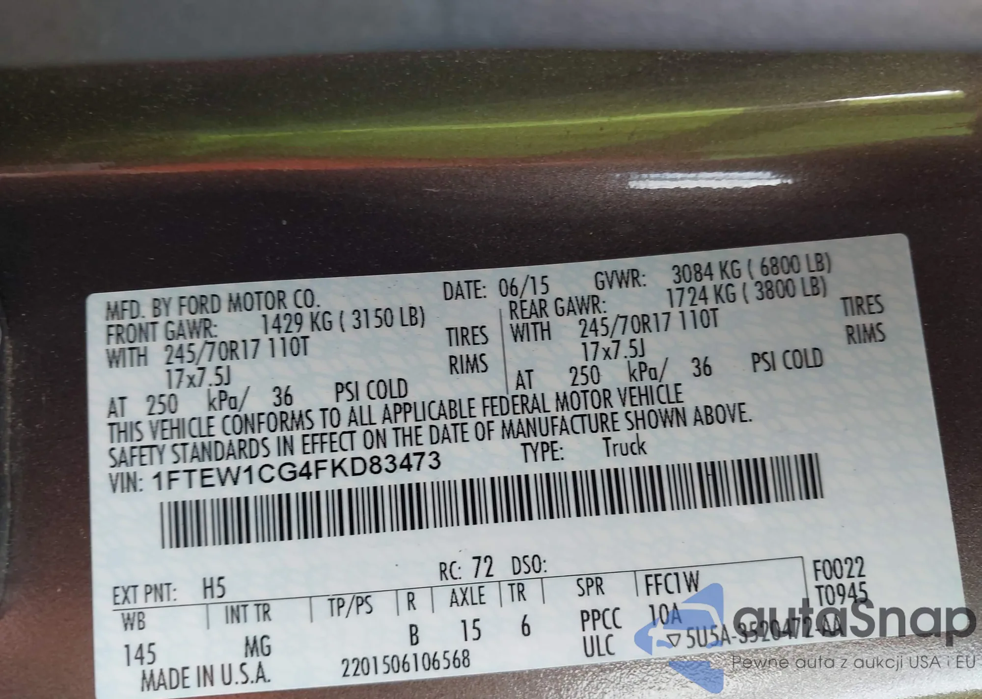 LOT: 44223352 VIN: 1FTEW1CG4FKD83473