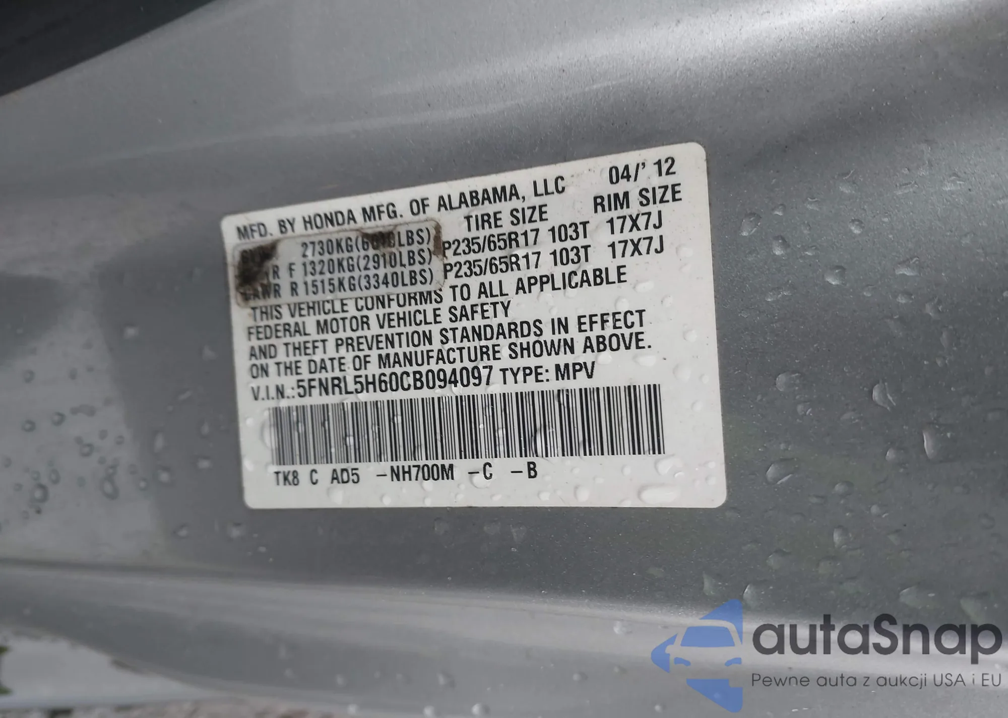 • VIN 5FNRL5H60CB094097