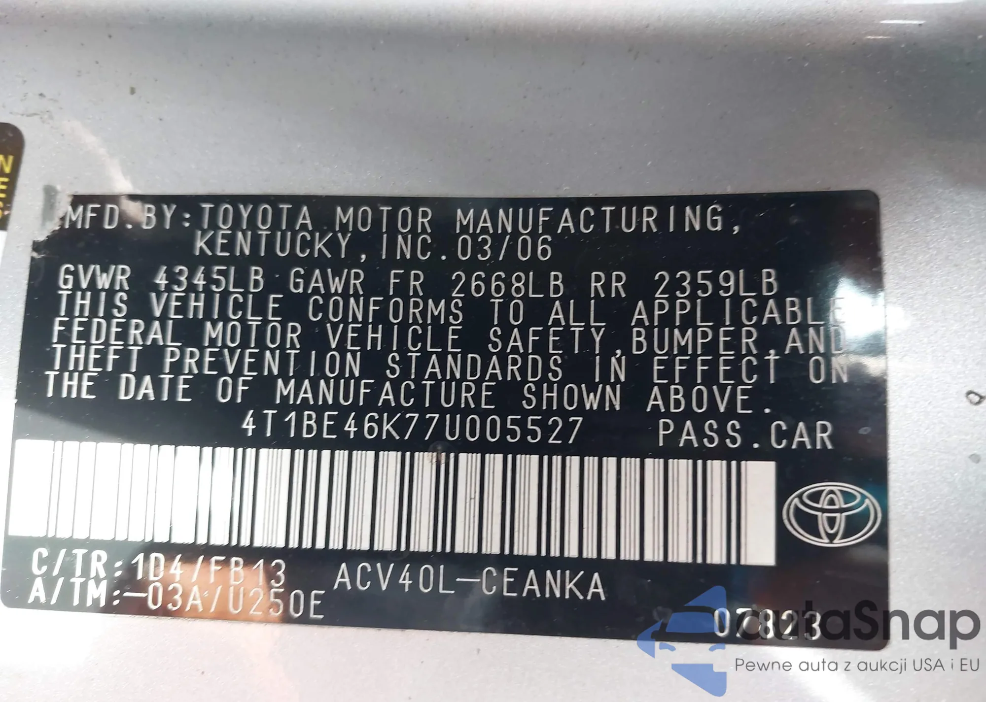 LOT: 43621657 VIN: 4T1BE46K77U005527