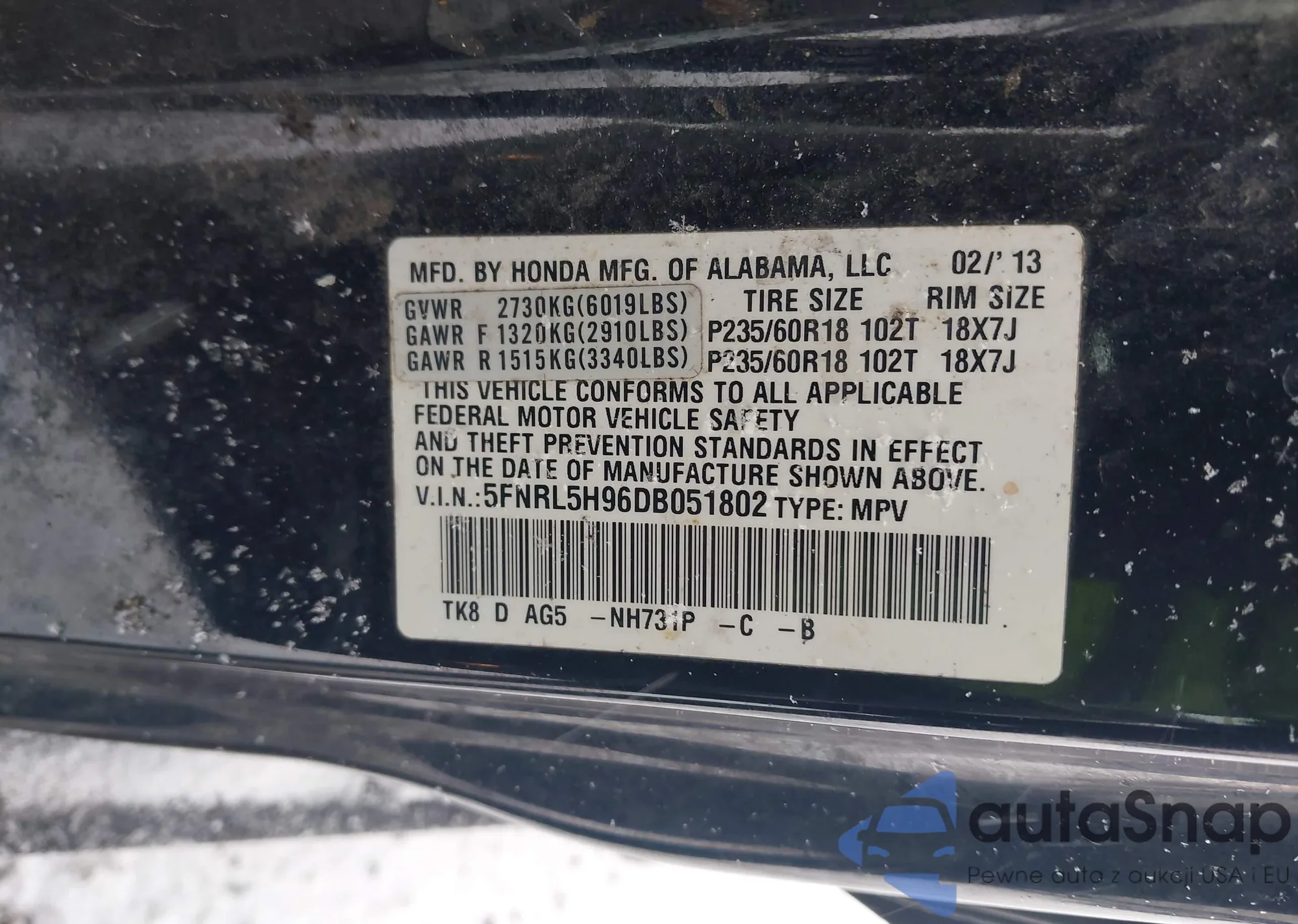 • VIN 5FNRL5H96DB051802