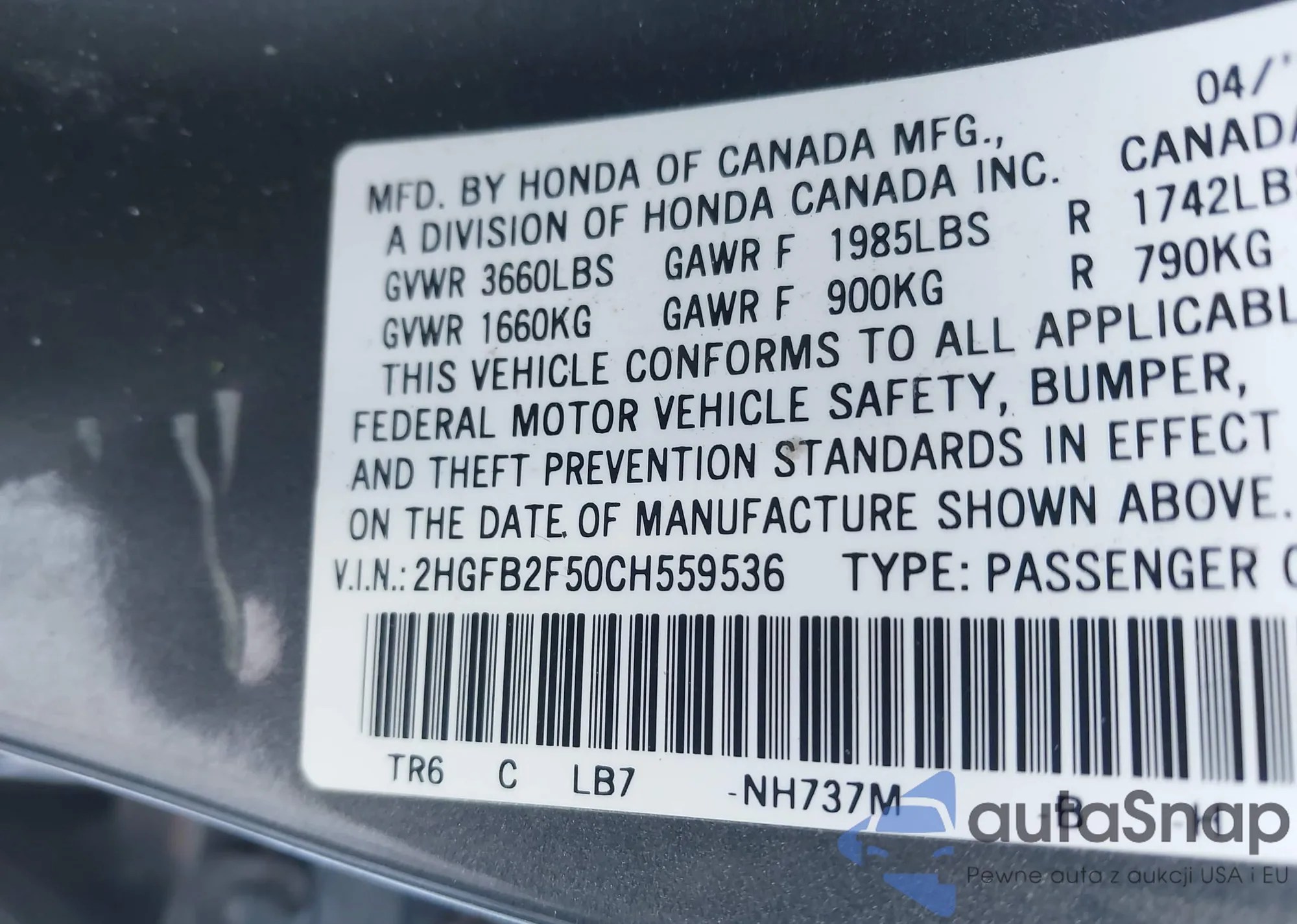 LOT: 44272948 VIN: 2HGFB2F50CH559536