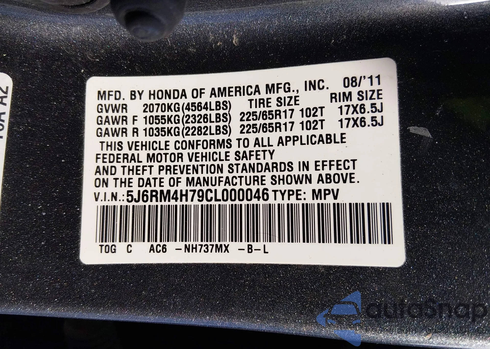 • VIN 5J6RM4H79CL000046