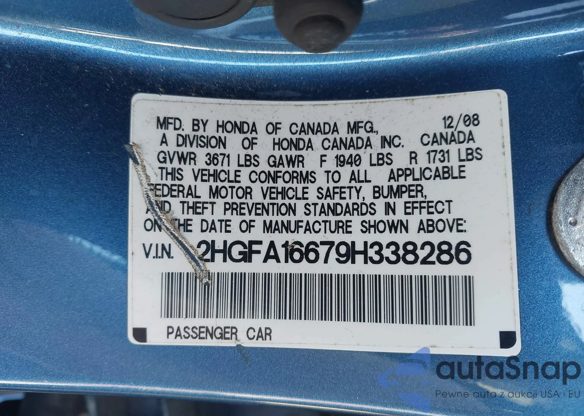 LOT: 44336327 VIN: 2HGFA16679H338286