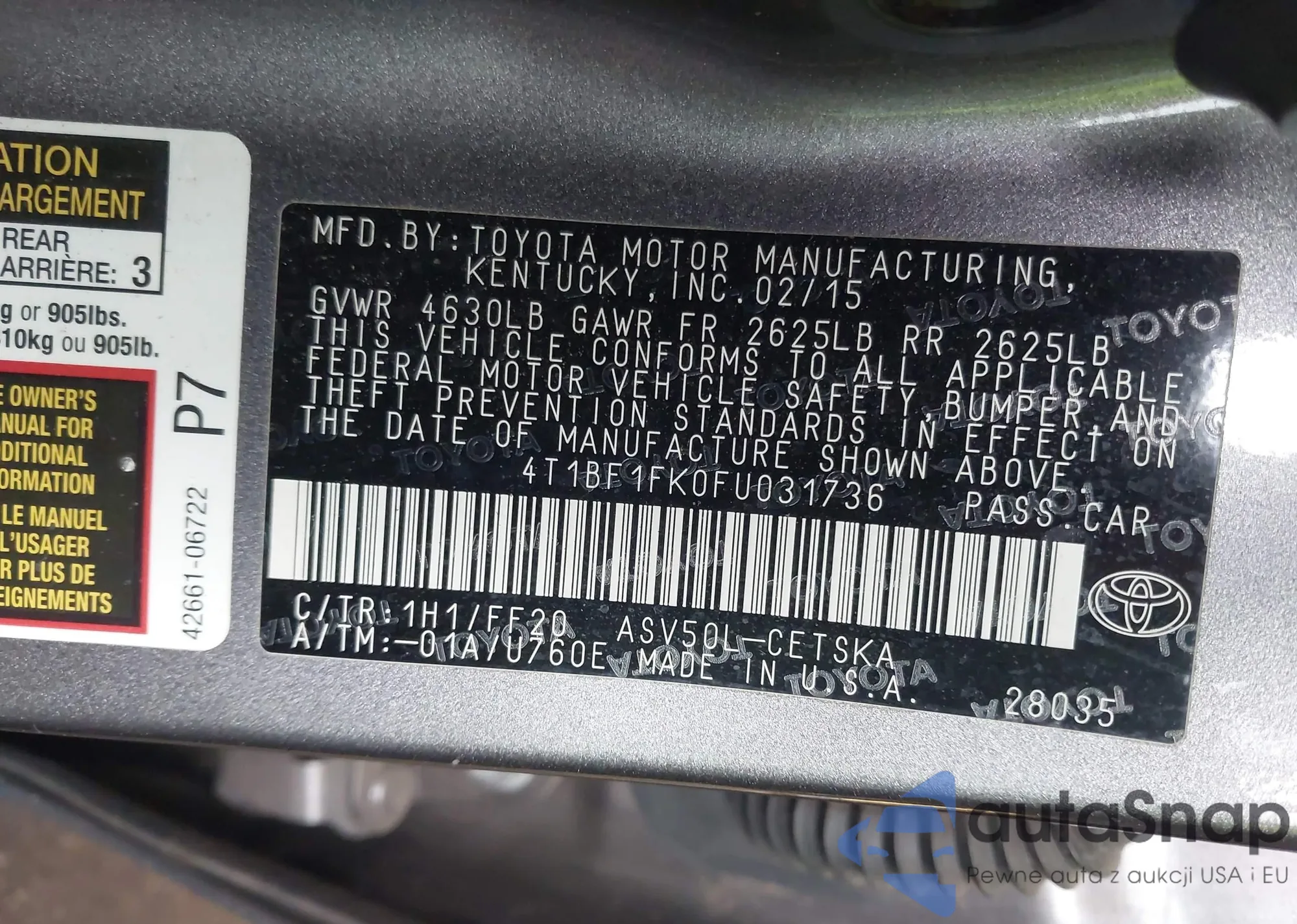 • VIN 4T1BF1FK0FU031736
