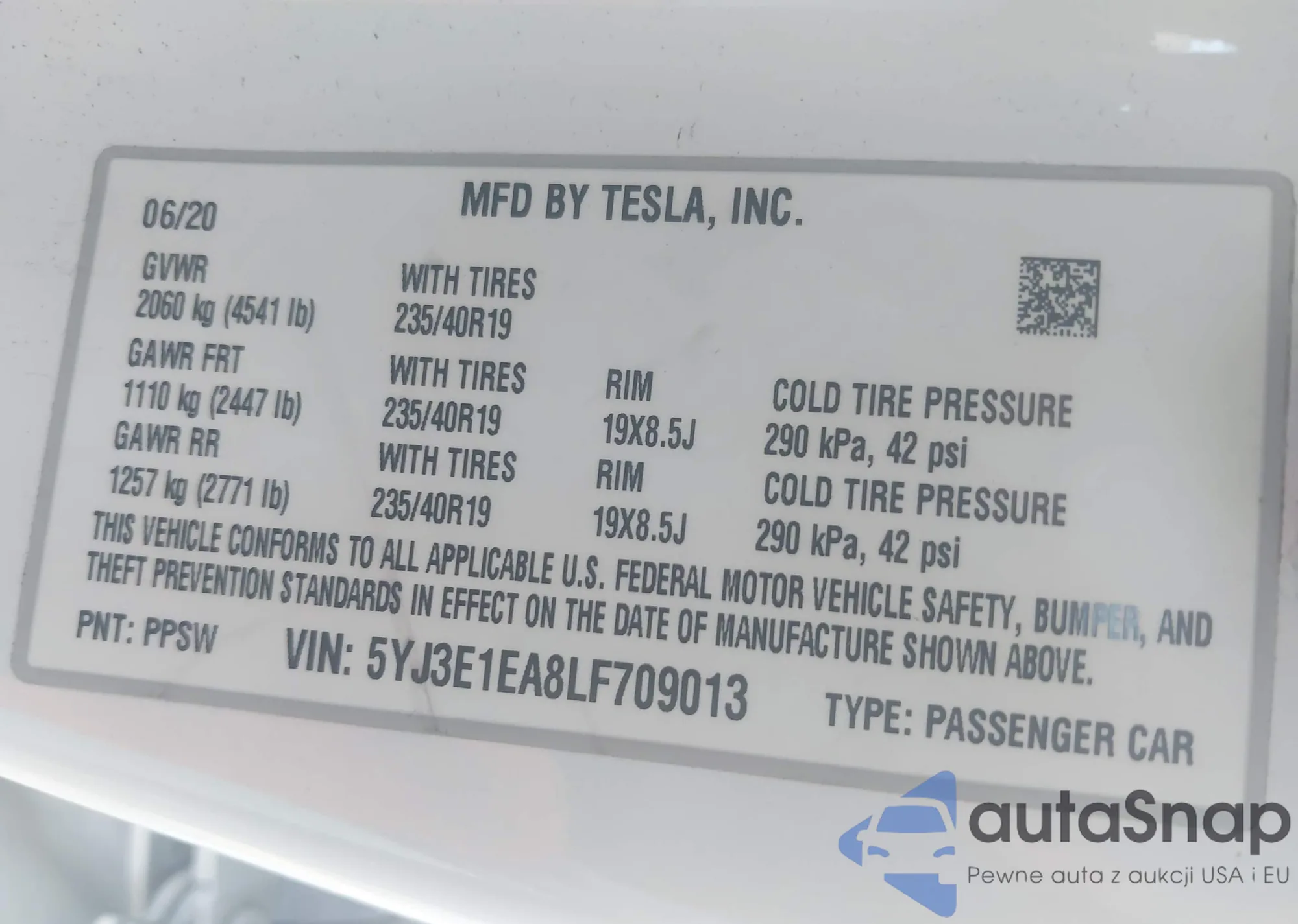 • VIN 5YJ3E1EA8LF709013