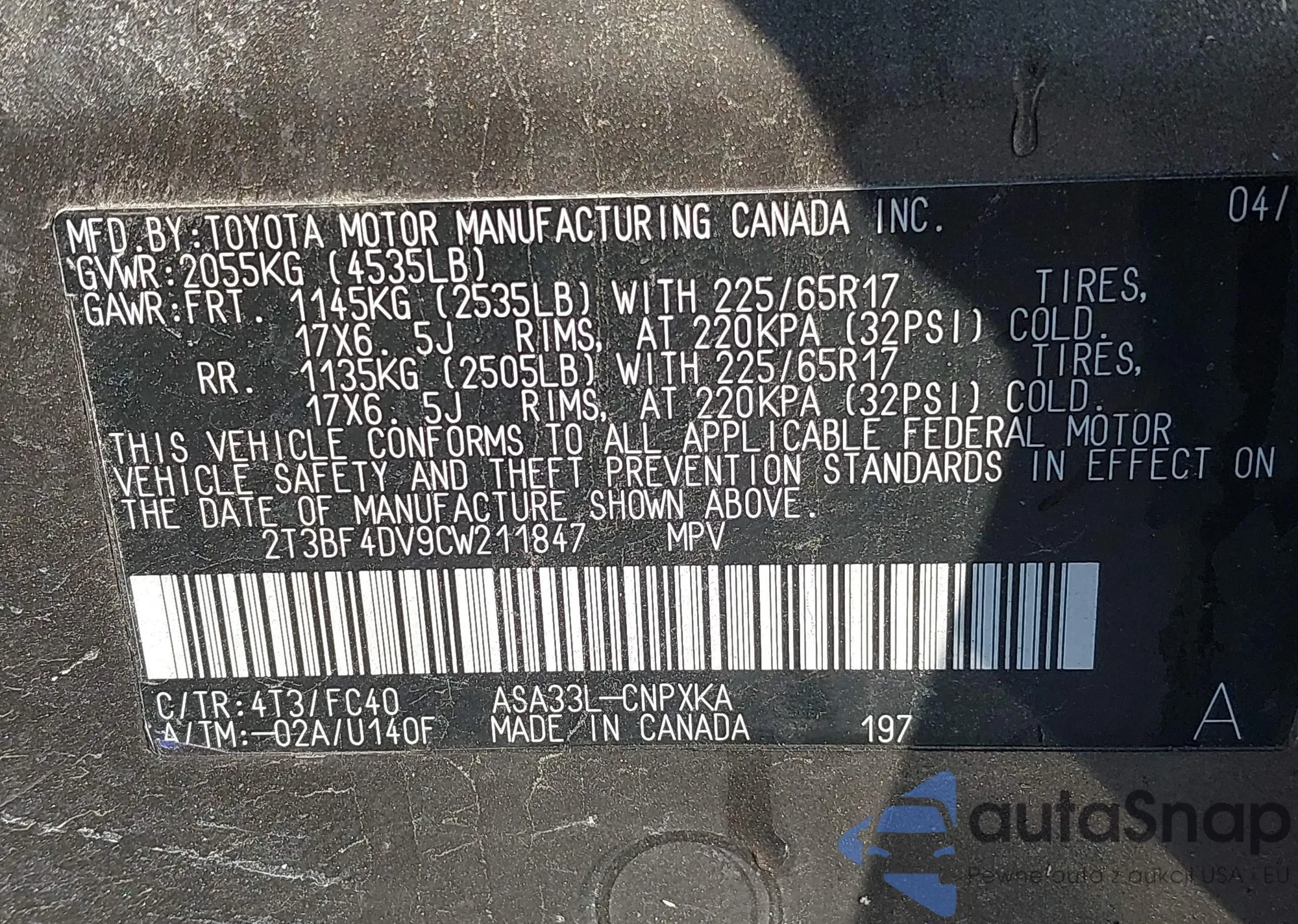 LOT: 43975630 VIN: 2T3BF4DV9CW211847