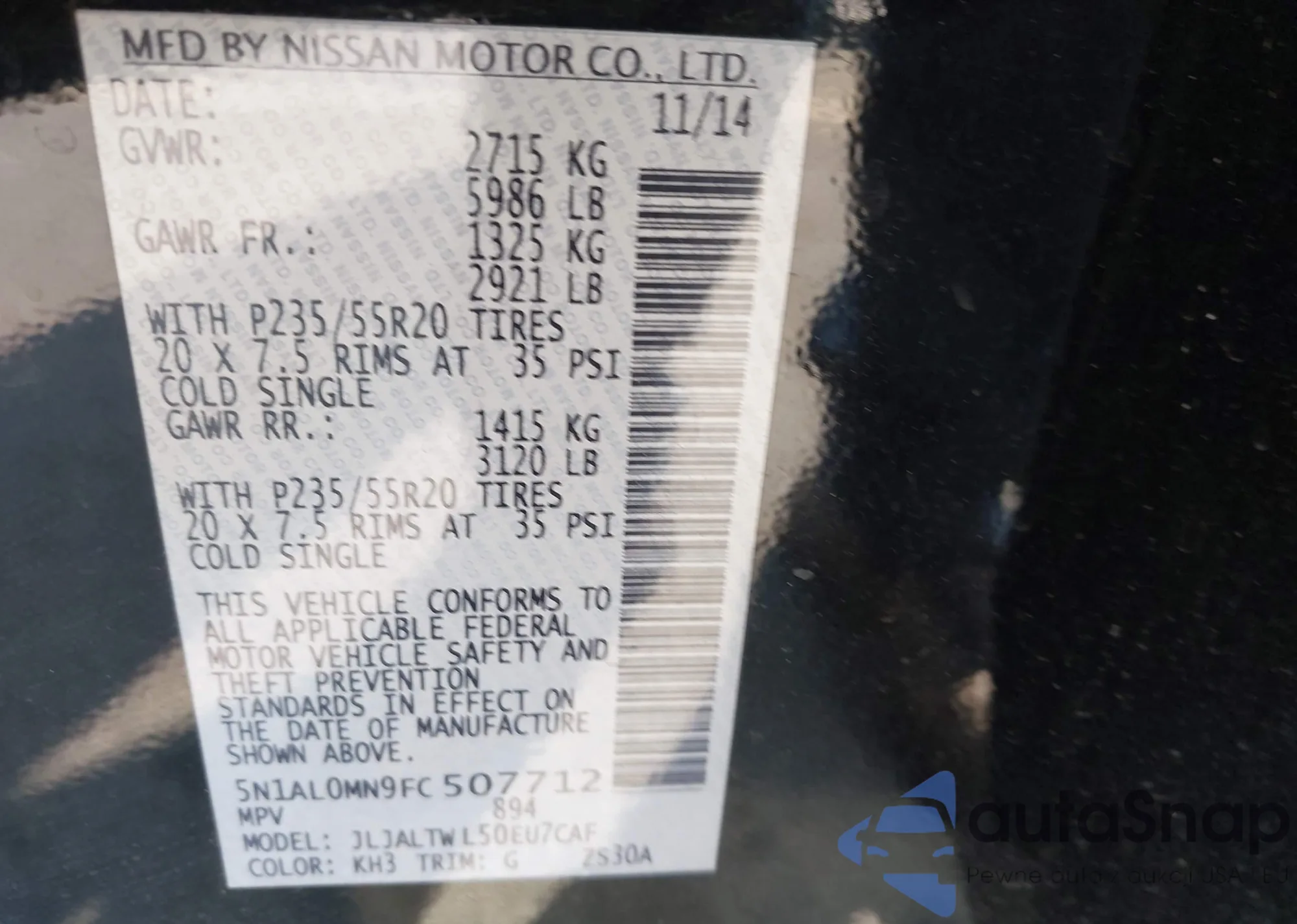 • VIN 5N1AL0MN9FC507712