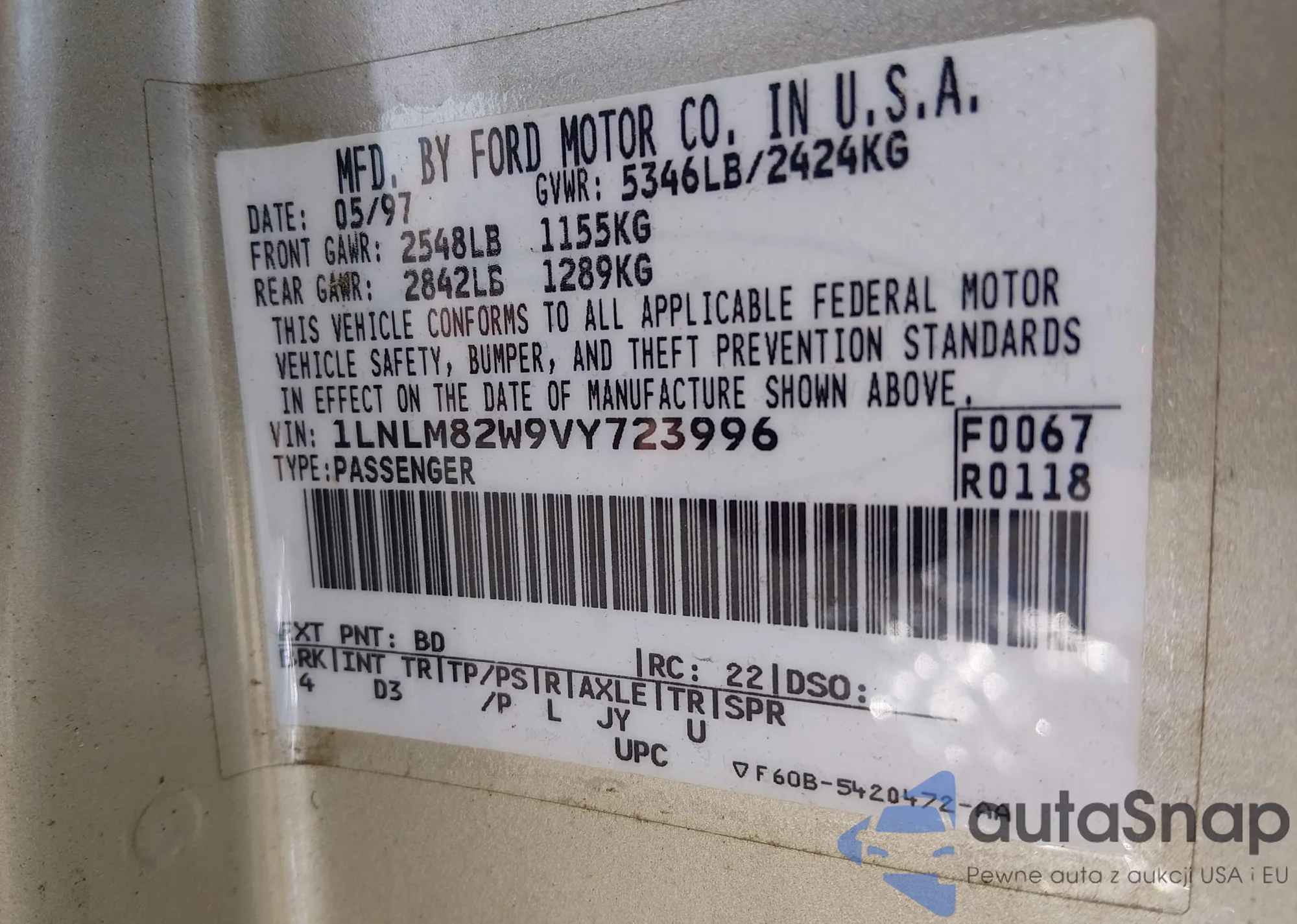 LOT: 44468795 VIN: 1LNLM82W9VY739692