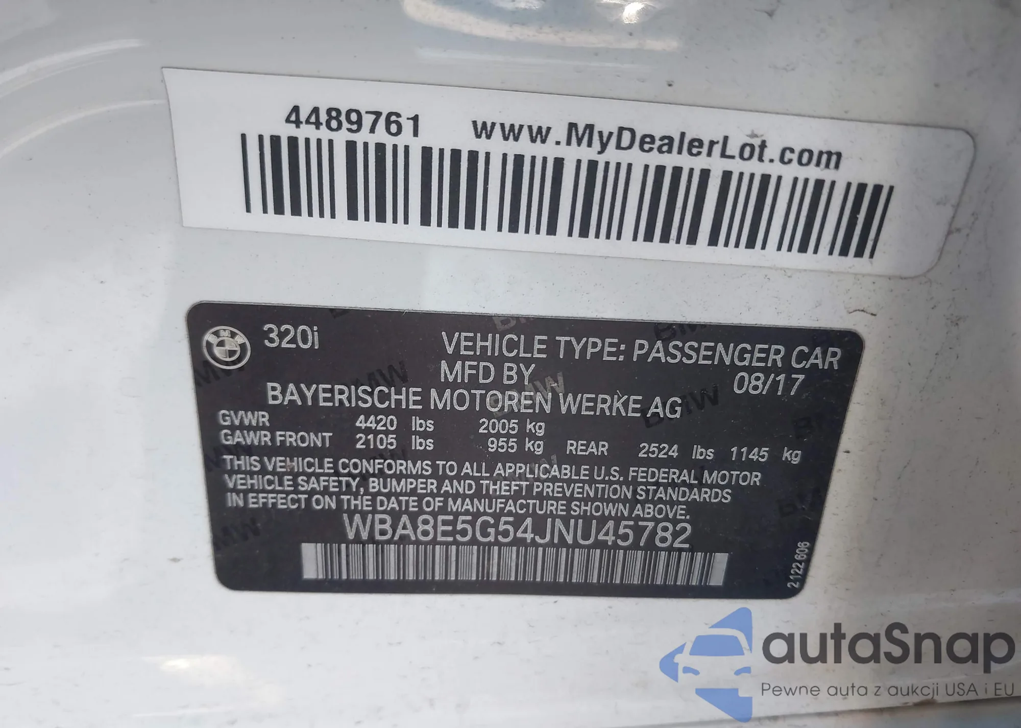 LOT: 44291012 VIN: WBA8E5G54JNU45782
