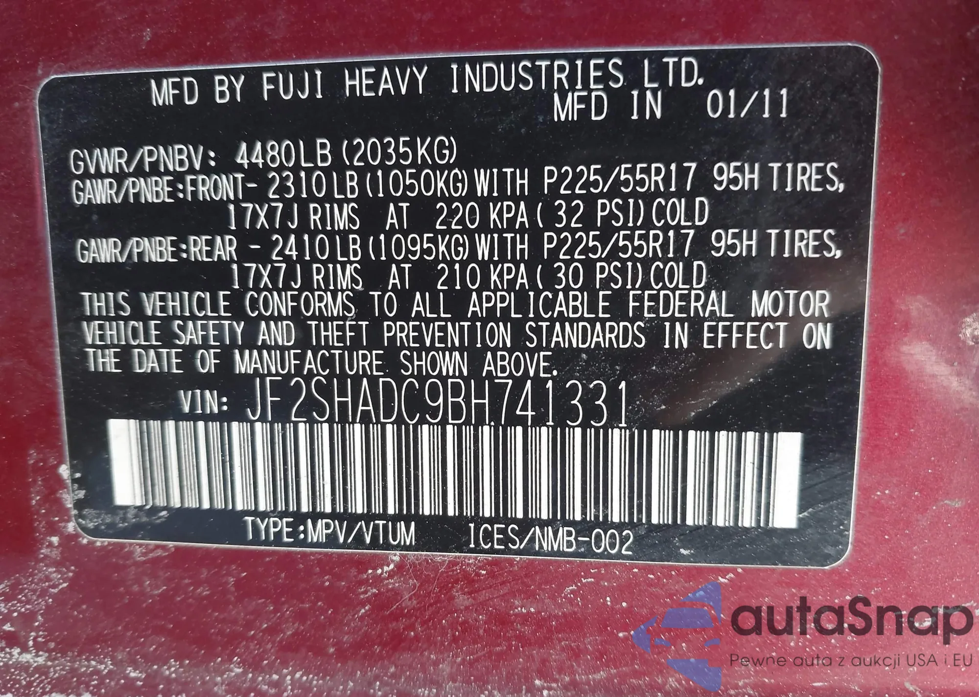 LOT: 44386307 VIN: JF2SHADC9BH741331