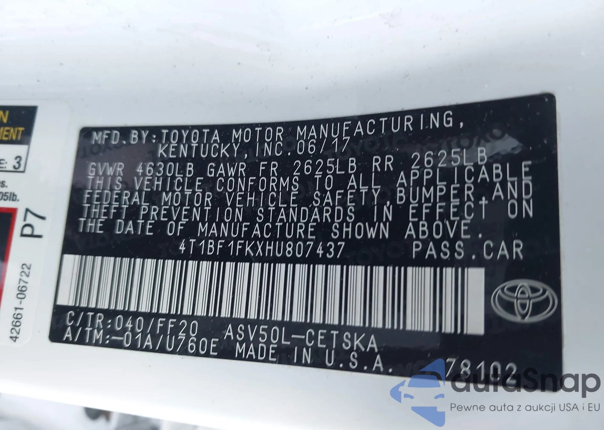 • VIN 4T1BF1FKXHU807437