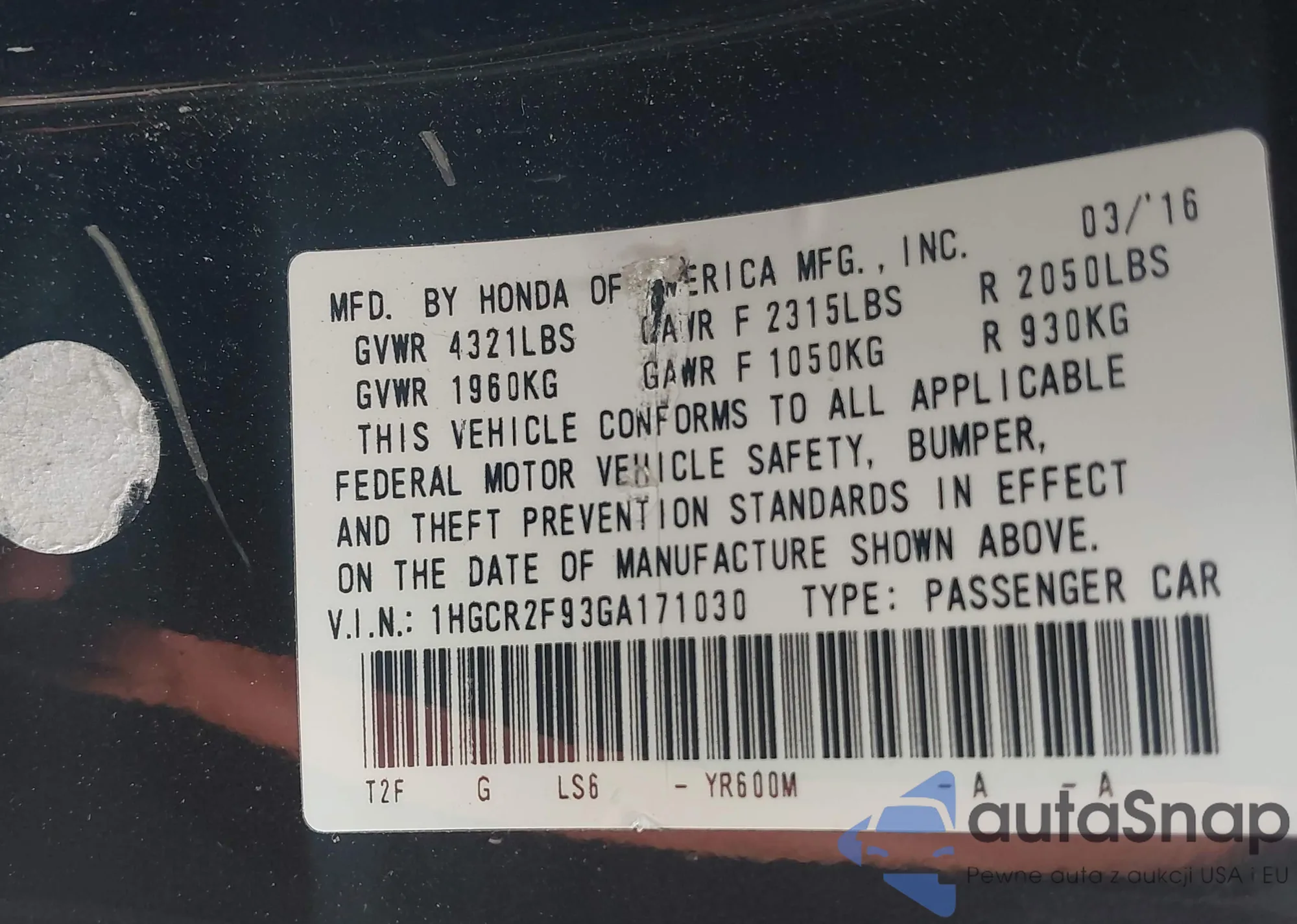 LOT: 44239961 VIN: 1HGCP2F8XAA188038