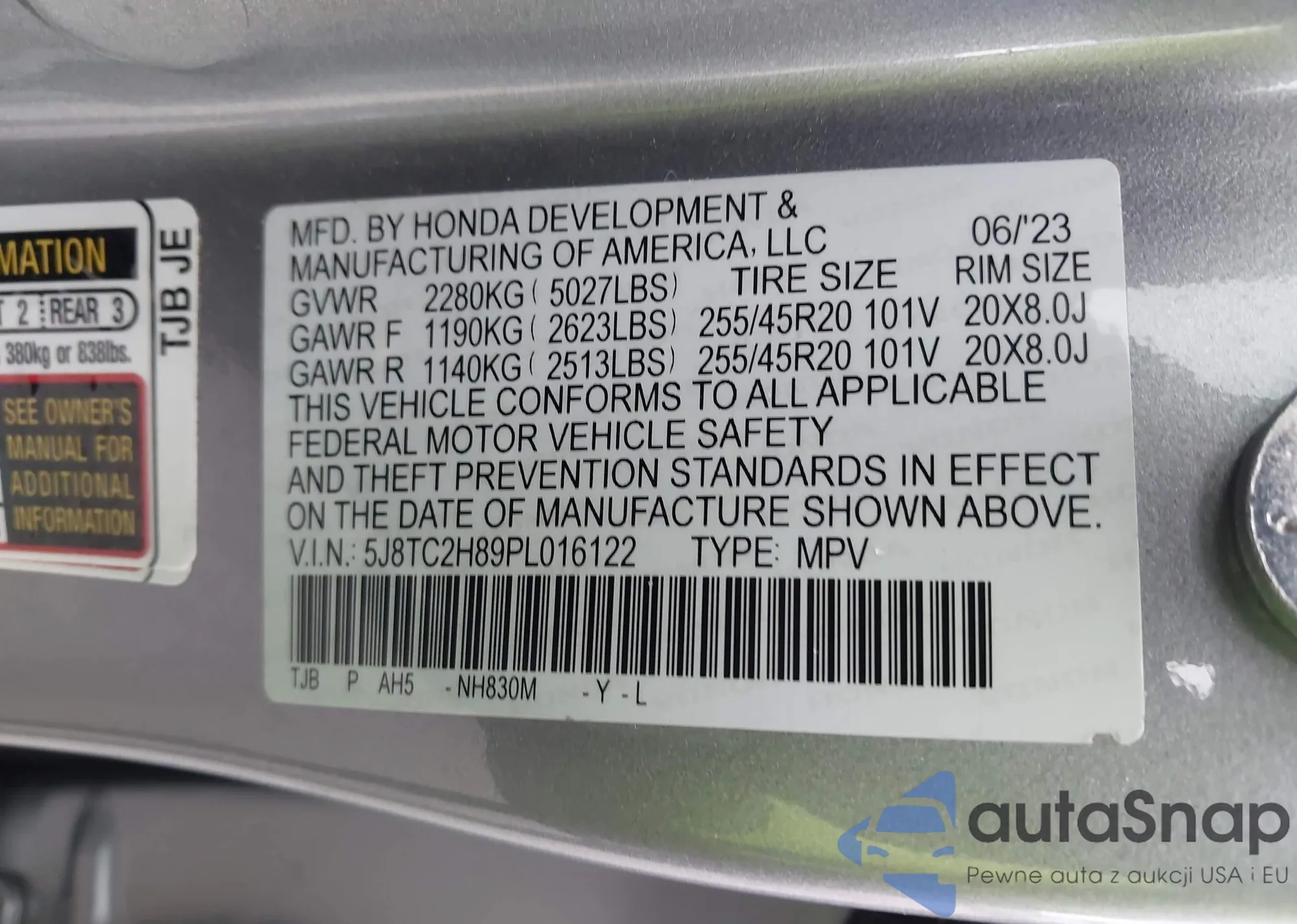 • VIN 5J8TC2H89PL016122