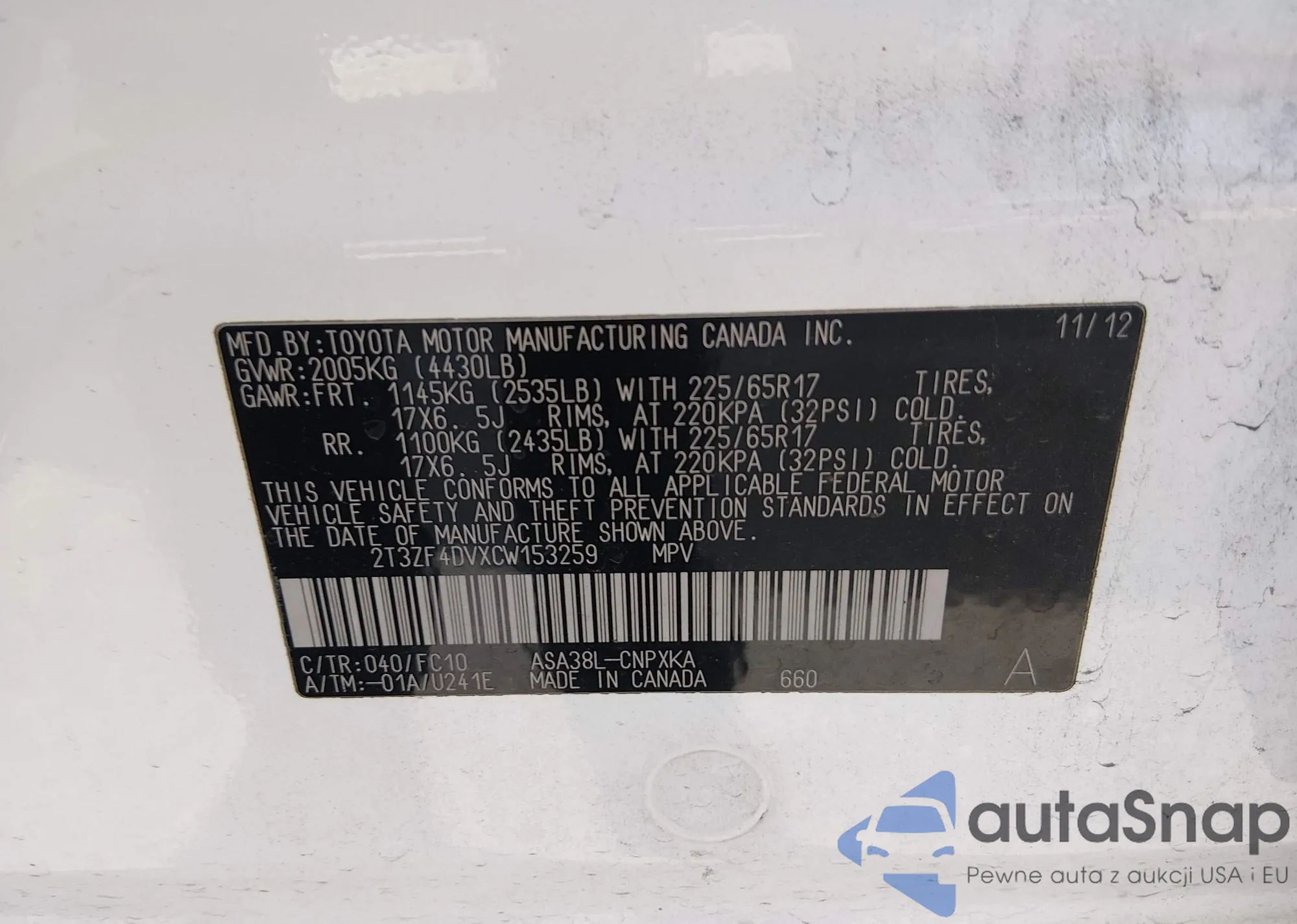 • VIN 2T3ZF4DVXCW153259