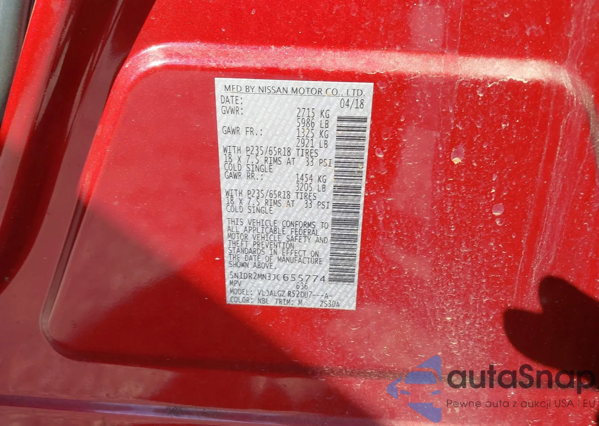 • VIN 5N1DR2MN3JC655774