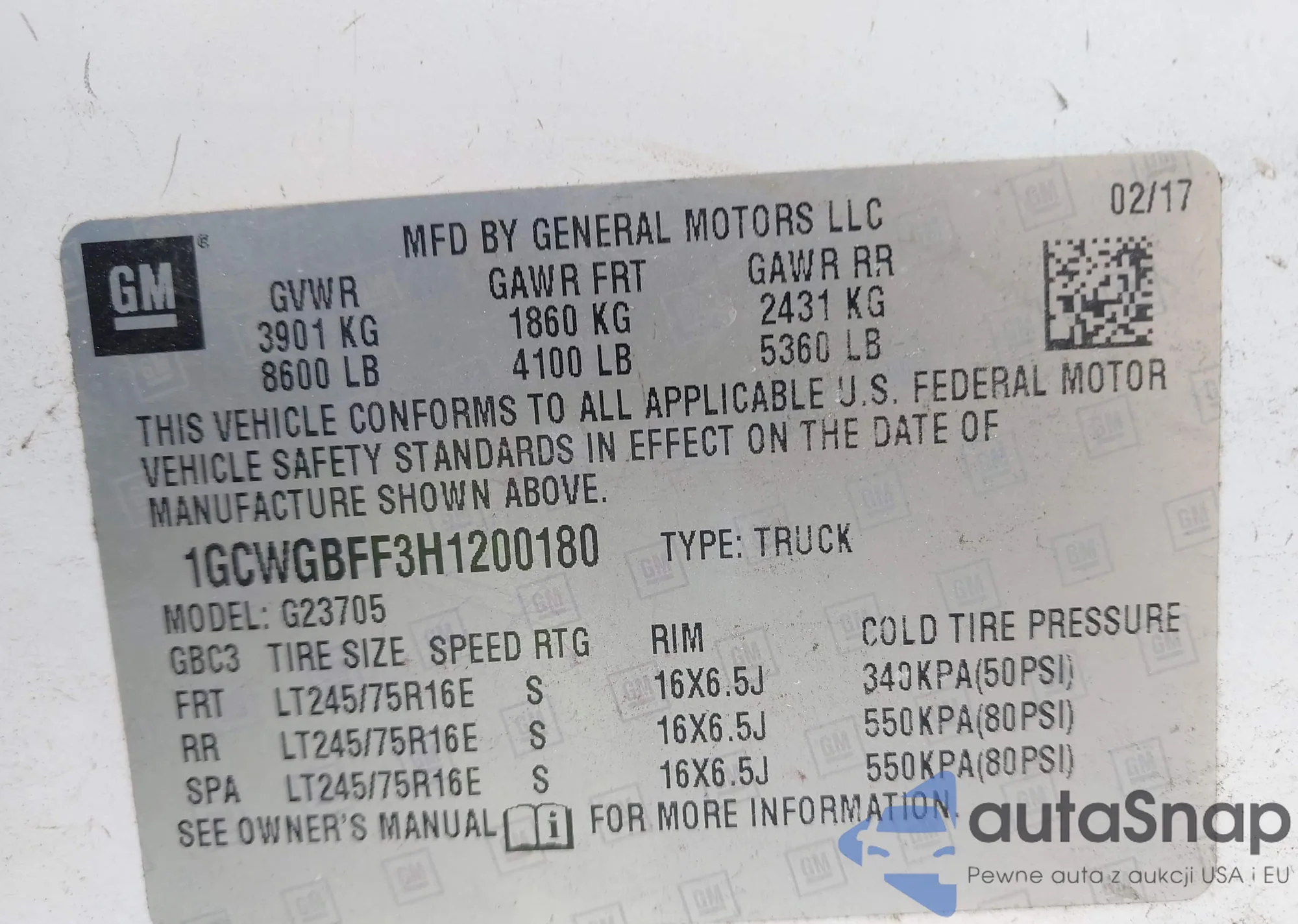• VIN 1GCWGBFF3H1200180
