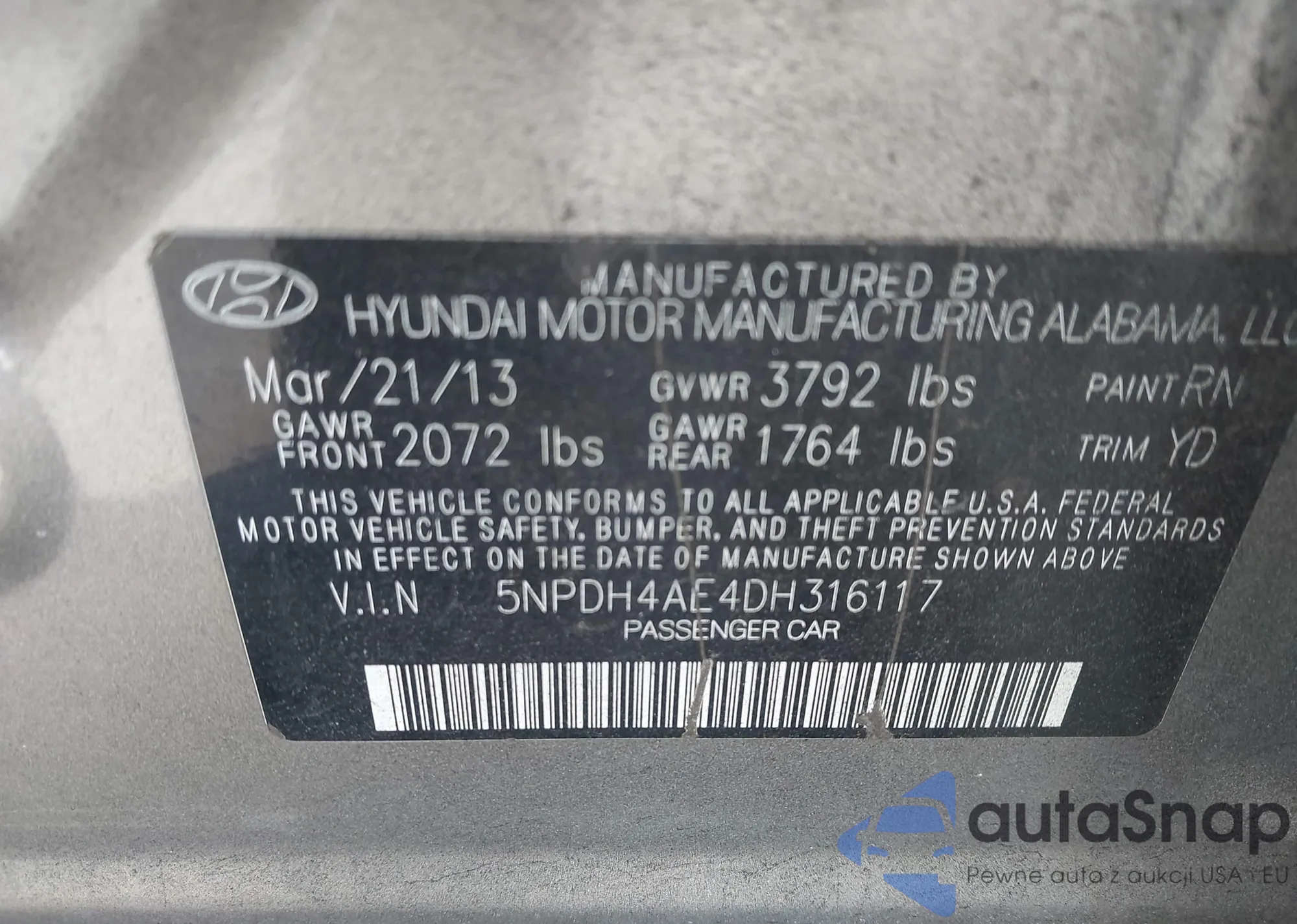 LOT: 44335495 VIN: 5NPDH4AE4DH316117