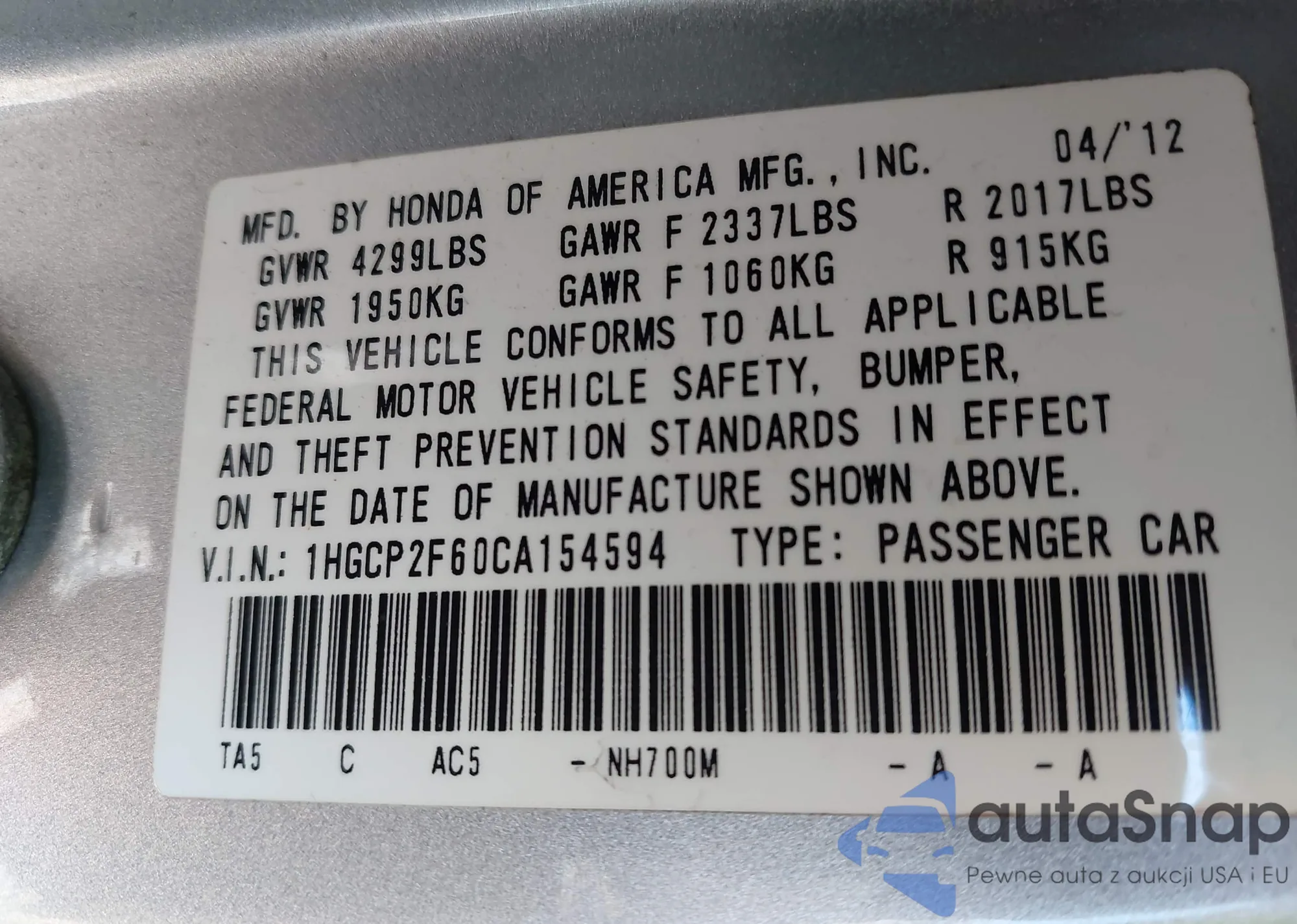 LOT: 44366727 VIN: 1HGCP2F60CA154594