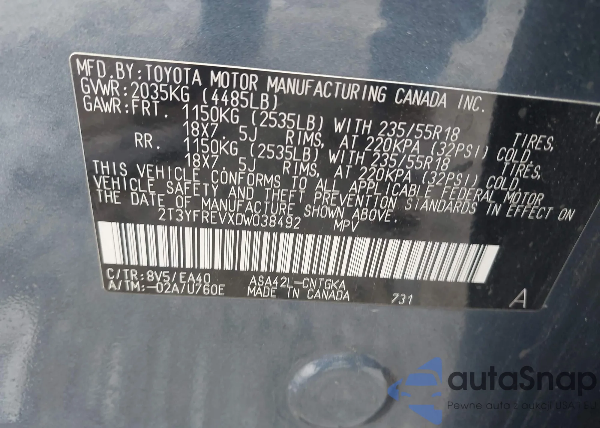 • VIN 2T3YFREVXDW038492