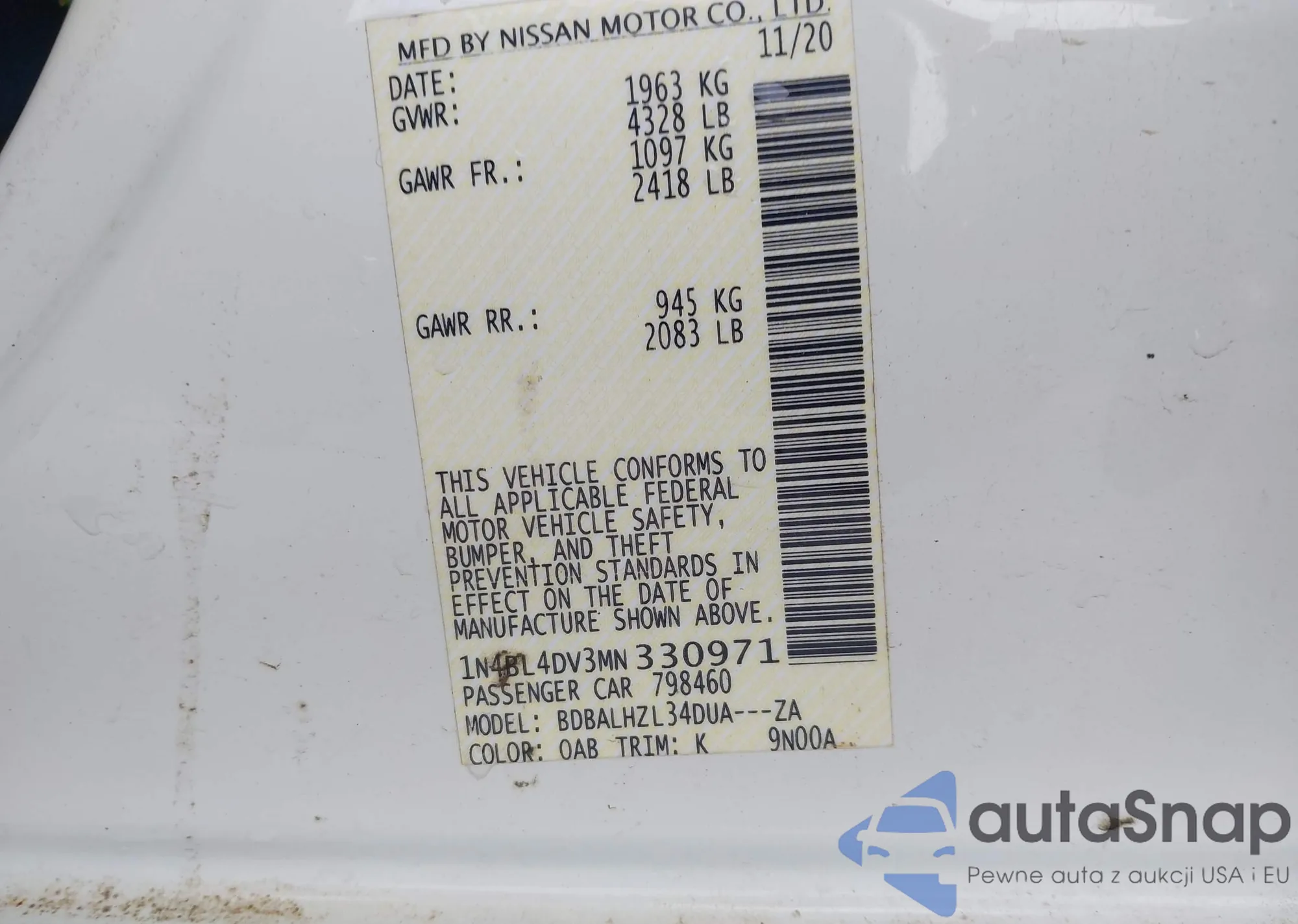 • VIN 1N4BL4DV3MN330971