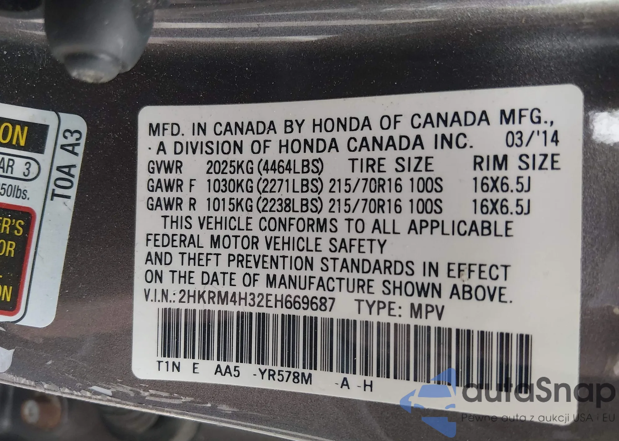 LOT: 44236440 VIN: 2HKRM4H32EH669687