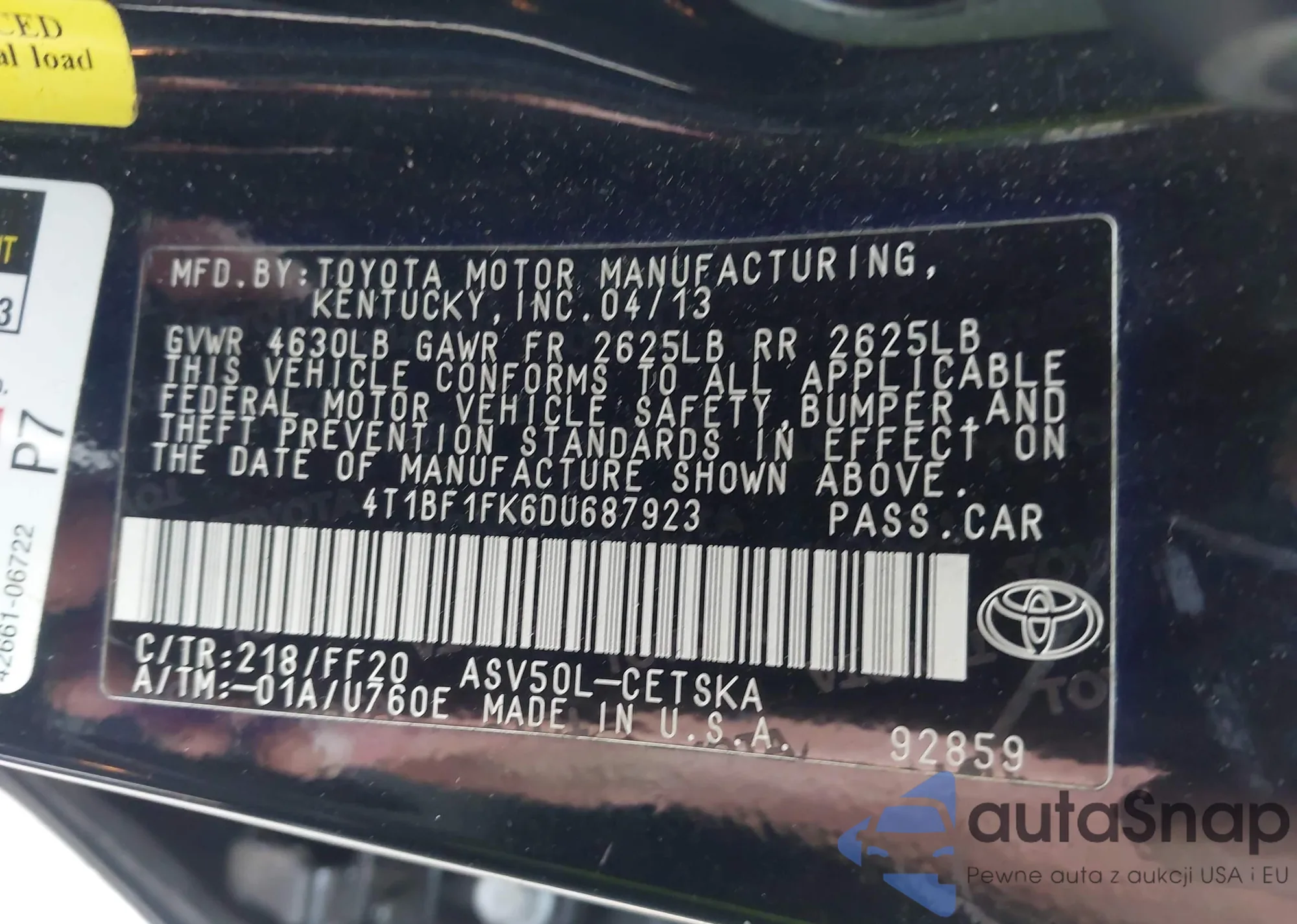 LOT: 44038689 VIN: 4T1BF1FK6DU687923