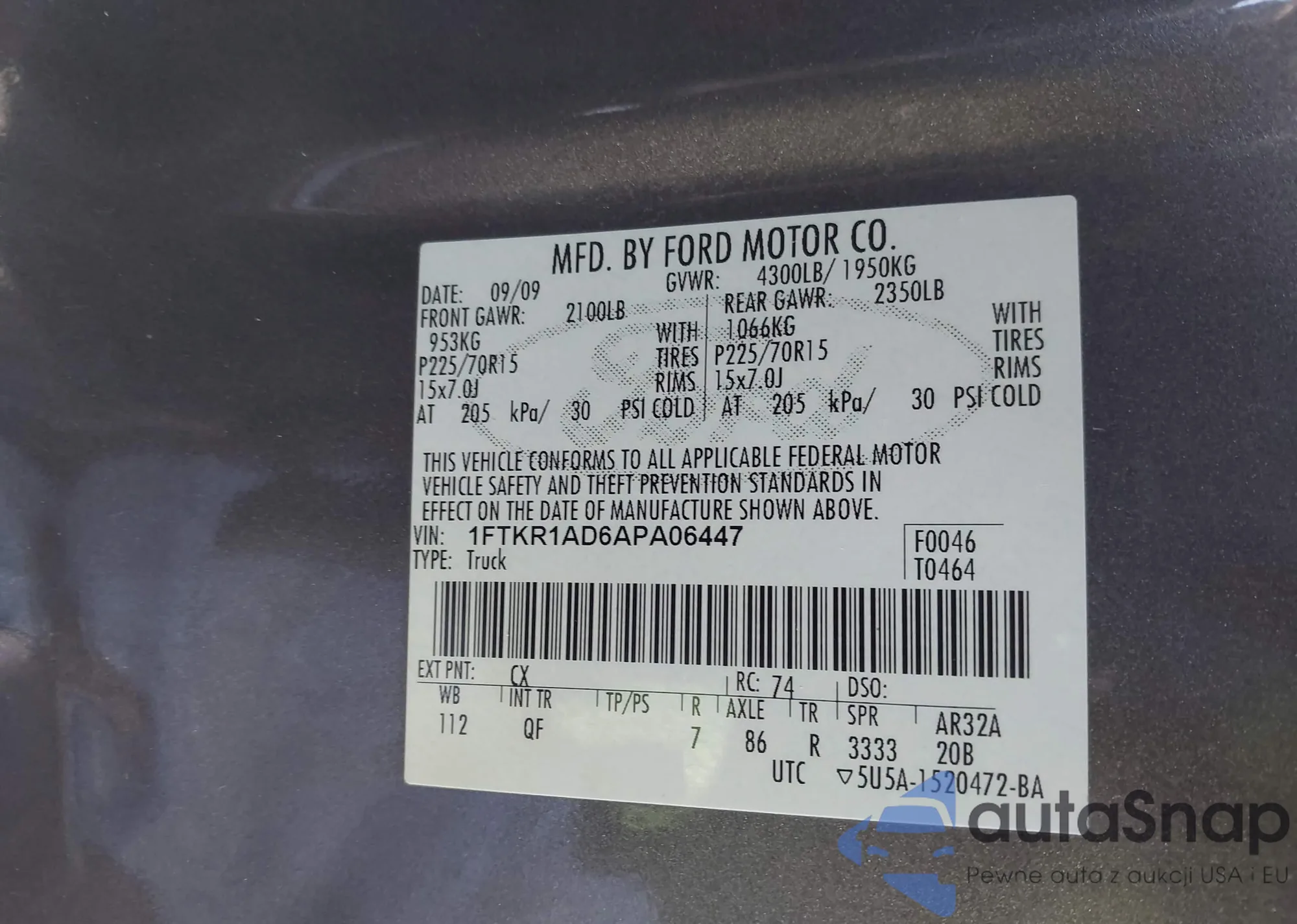 • VIN 1FTKR1AD6APA06447