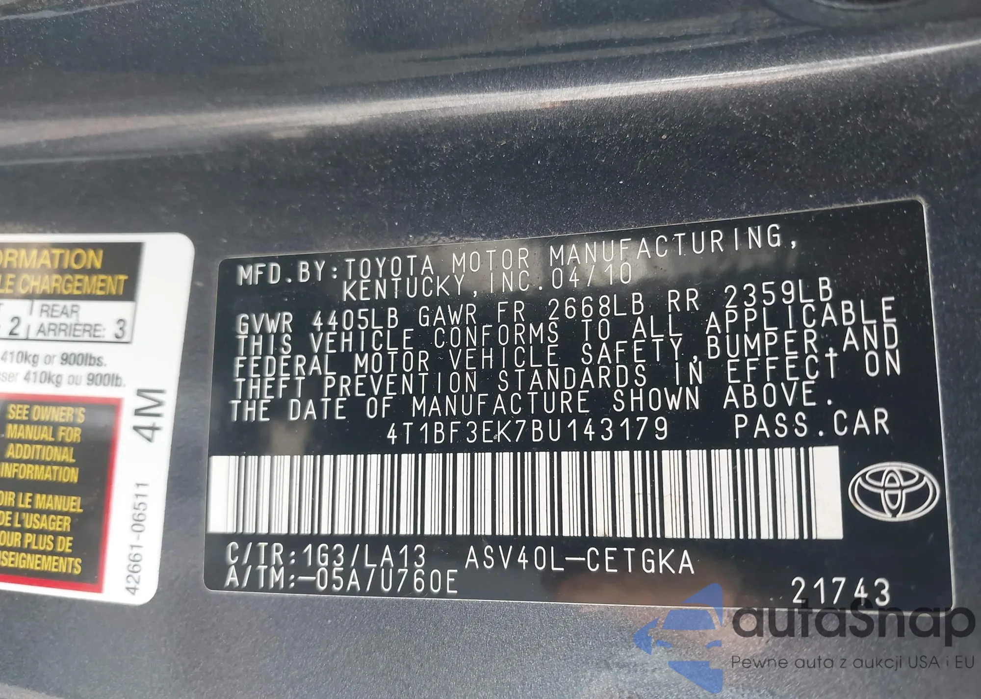• VIN 4T1BF3EK7BU143179