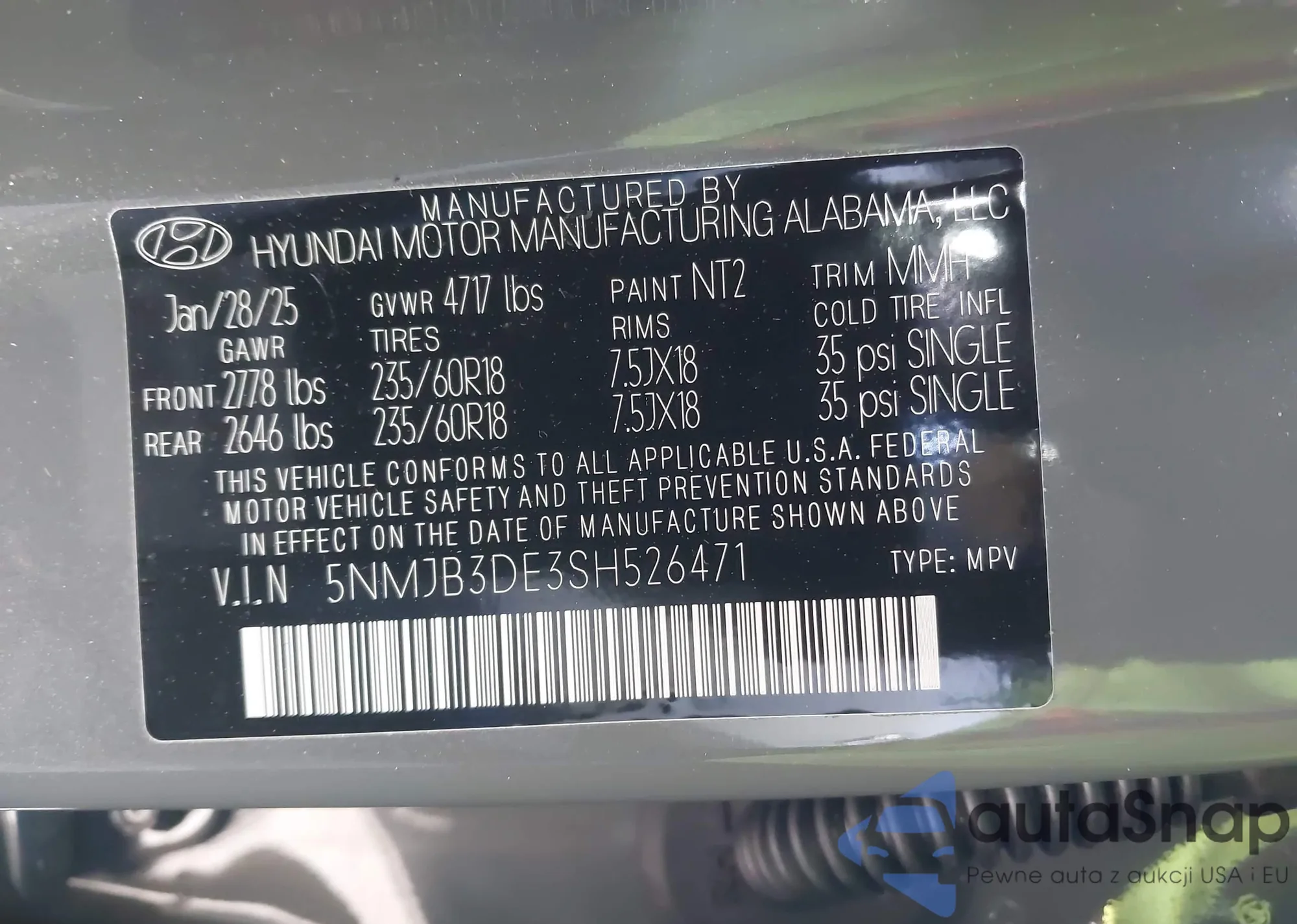 • VIN 5NMJB3DE3SH526471