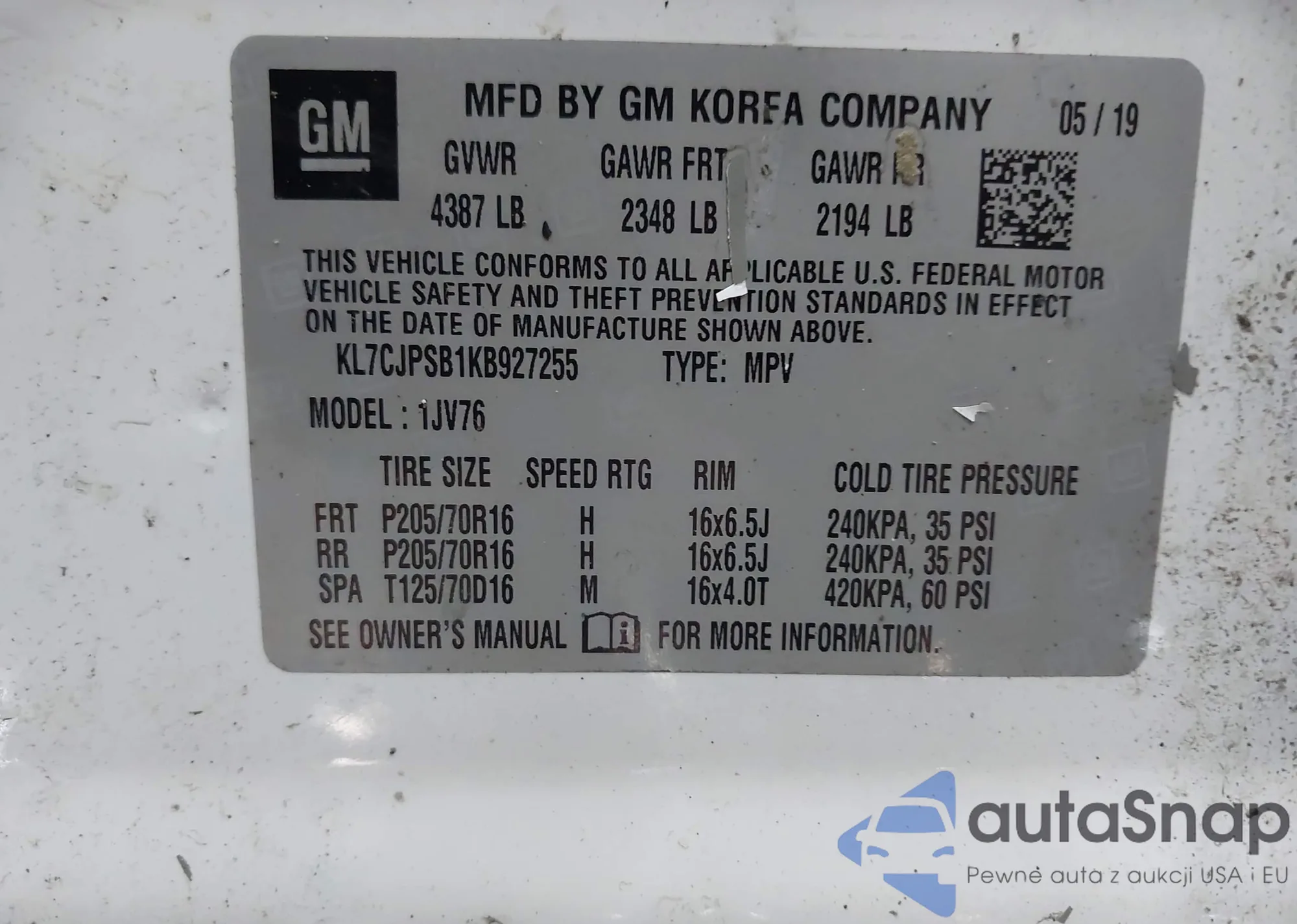 • VIN KL7CJPSB1KB927255