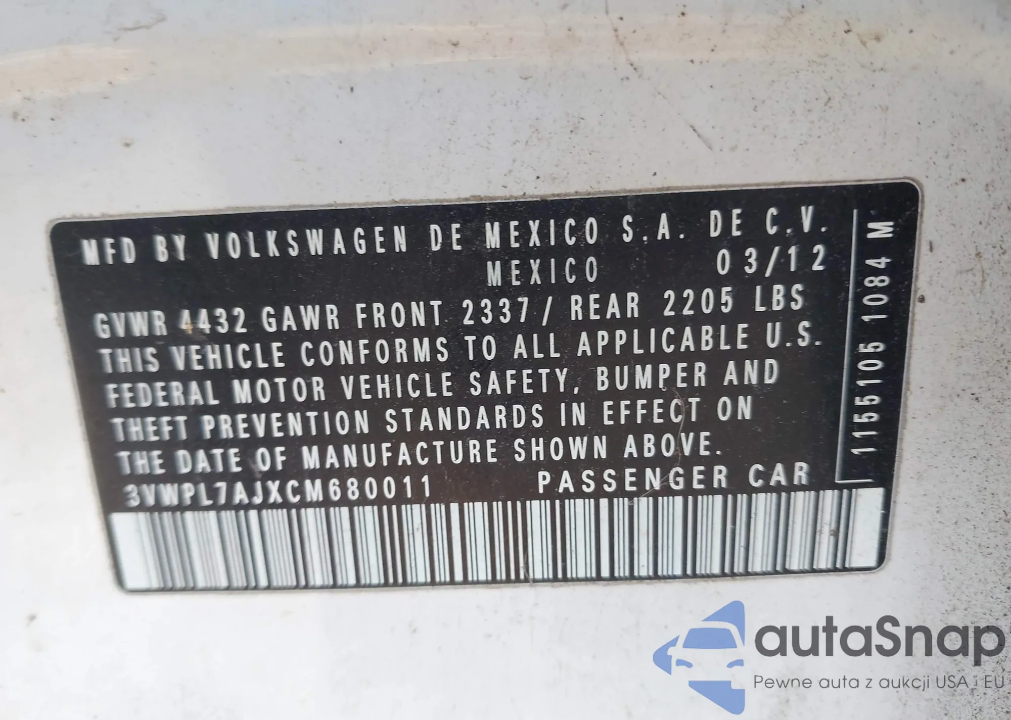 LOT: 44563964 VIN: 1VWCP7A38CC065219